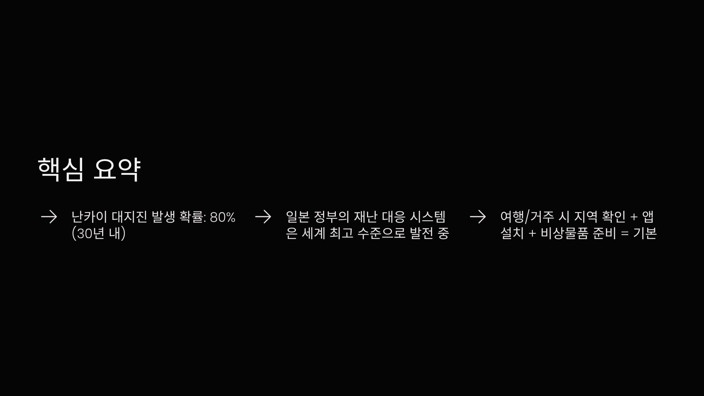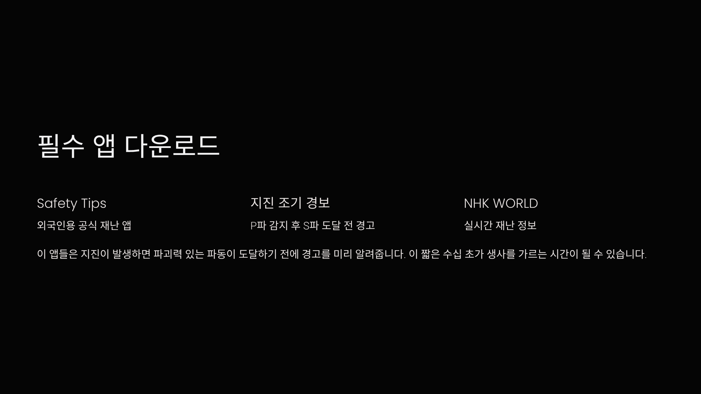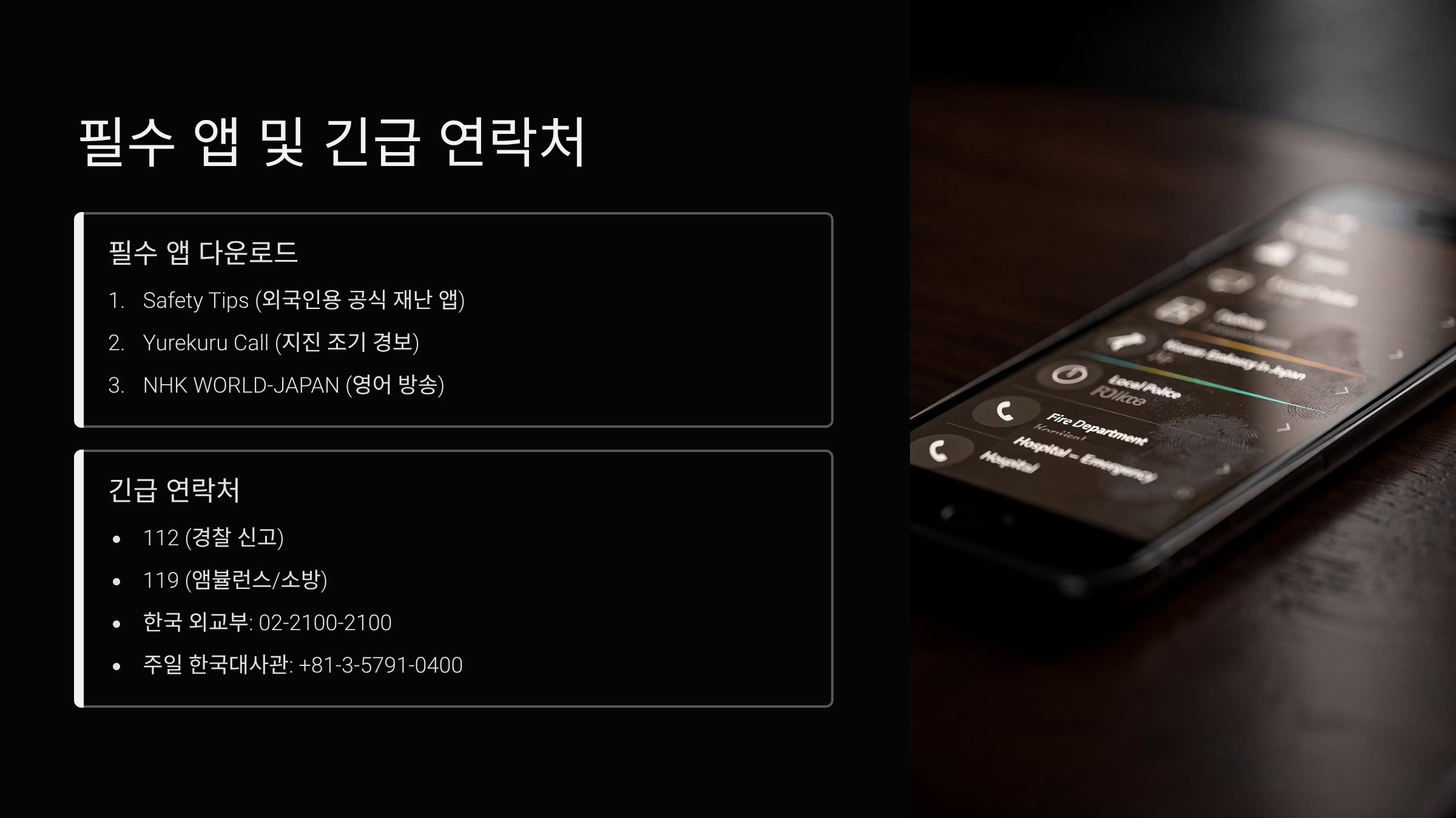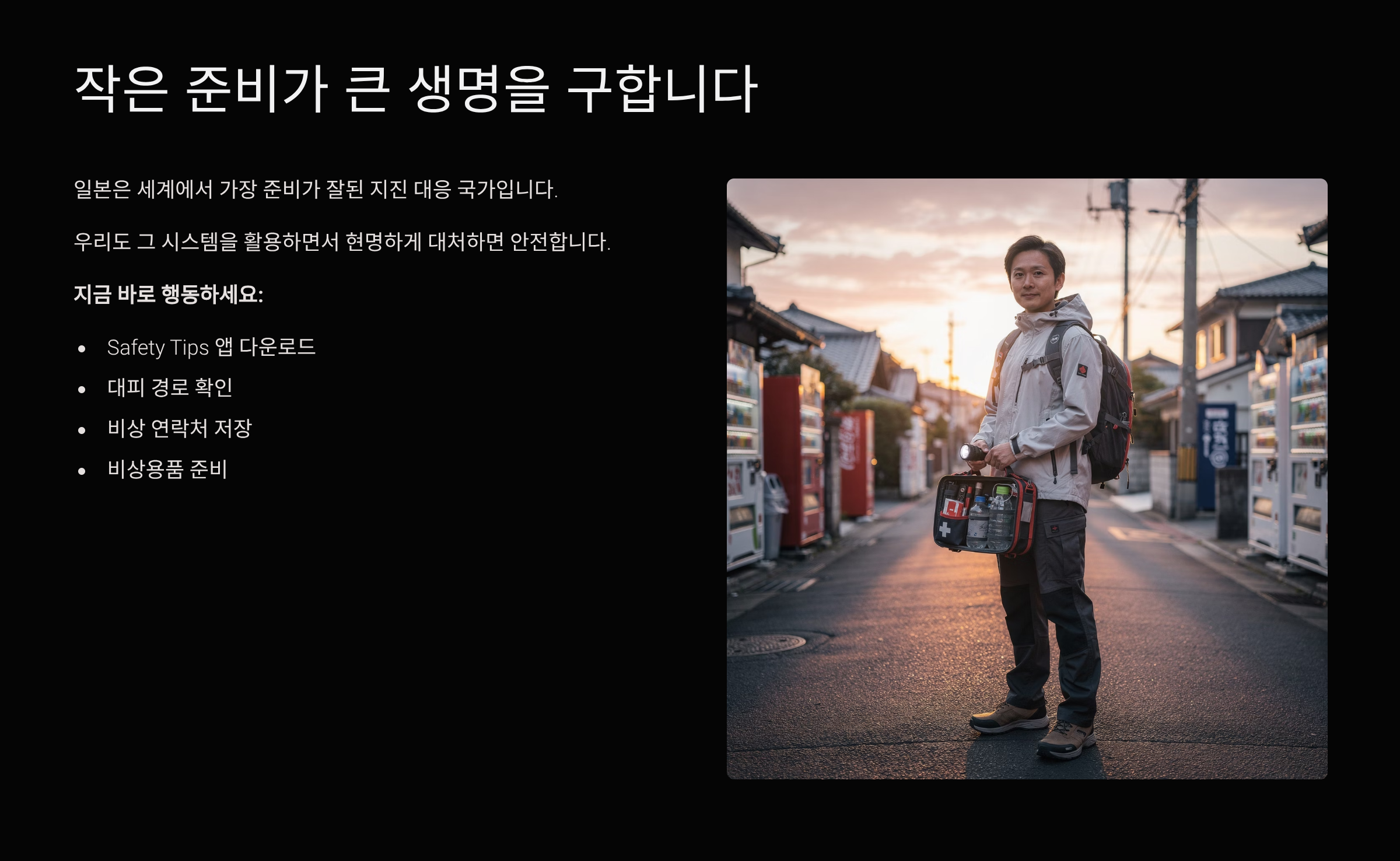 작은 준비가 큰 생명을 구합니다. 일본은 세계에서 가장 준비가 잘된 지진 대응 국가입니다. 우리도 그 시스템을 활용하면서 현명하게 대처하면 안전합니다.