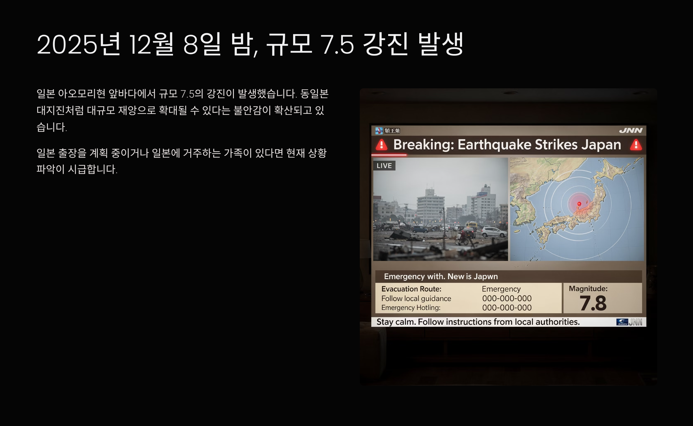 2025년 12월 8일 밤 11시 15분, 일본 아오모리현 앞바다에서 규모 7.5의 강진이 발생했습니다. 오늘 아침 뉴스를 켰을 때 일본 지진 관련 속보가 계속 나오고 있는데, 혹시 이번 지진이 동일본 대지진처럼 대규모 재앙으로 확대될 수 있다는 생각에 불안해하시는 분들이 많으실 거라 예상됩니다. 특히 일본 출장을 계획 중이거나 일본에서 거주하는 가족이 있으신 분들이라면 현재 상황이 정말 궁금하실 텐데요.