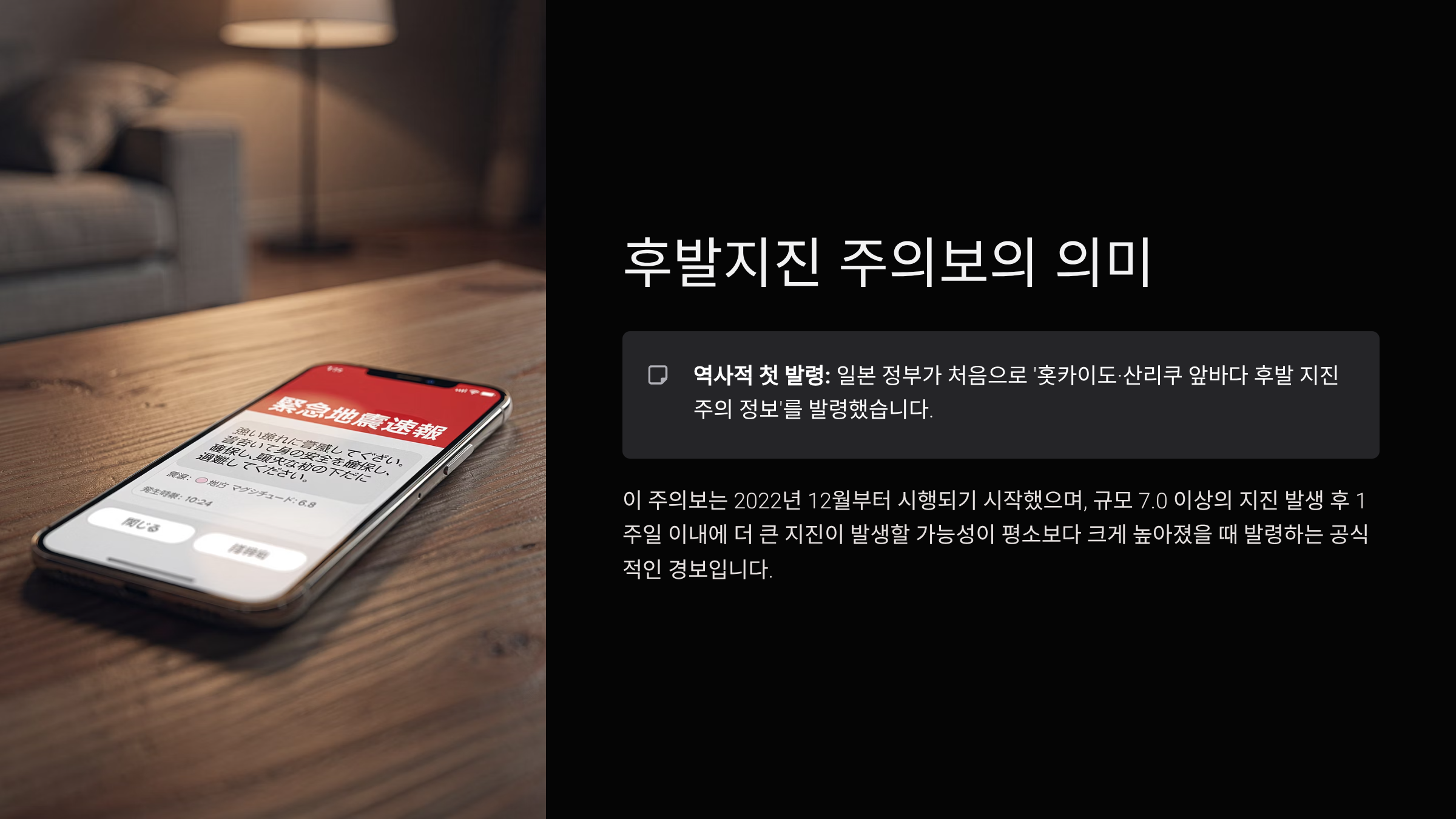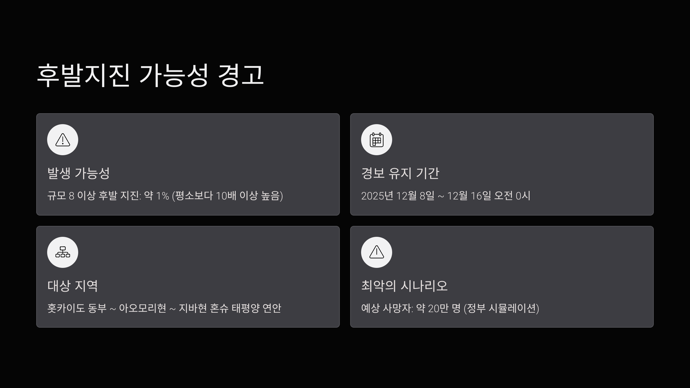 이번 지진의 가장 중요한 특징은 일본 정부가 처음으로 '홋카이도·산리쿠 앞바다 후발 지진 주의 정보'를 발령했다는 점입니다. 이 주의보는 2022년 12월부터 시행되기 시작했으며, 규모 7.0 이상의 지진 발생 후 1주일 이내에 더 큰 지진이 발생할 가능성이 평소보다 크게 높아졌을 때 발령하는 공식적인 경보입니다.