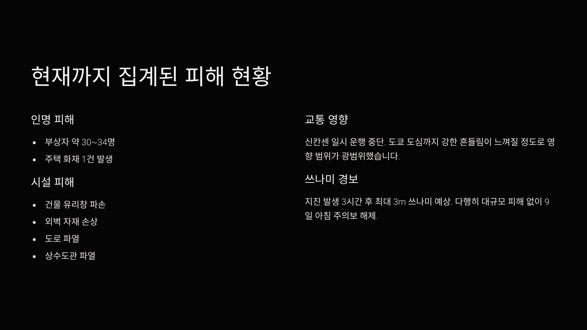 현재까지 집계된 피해 현황은 다음과 같습니다. 부상자 수는 약 30~34명으로 파악되고 있으며, 주택 화재 1건이 발생했습니다. 아오모리현과 이와테현, 홋카이도 일부 지역에서 건물 유리창 파손, 외벽 자재 손상, 도로 파열, 상수도관 파열 등이 보고되었습니다. 신칸센(일본의 고속열차)은 일시적으로 운행을 중단했으며, 도쿄 도심까지 강한 흔들림이 느껴질 정도로 영향 범위가 광범위했습니다.