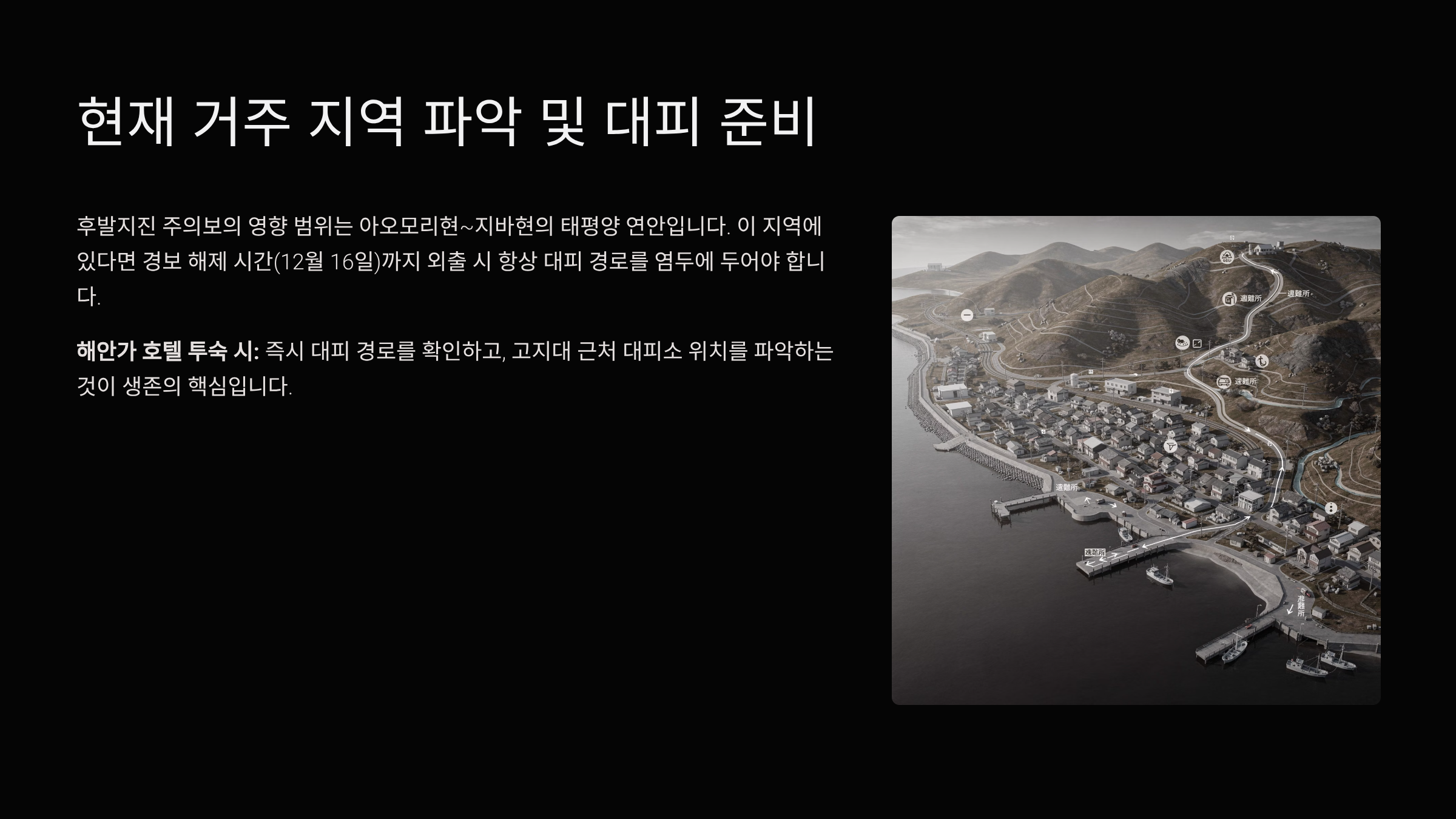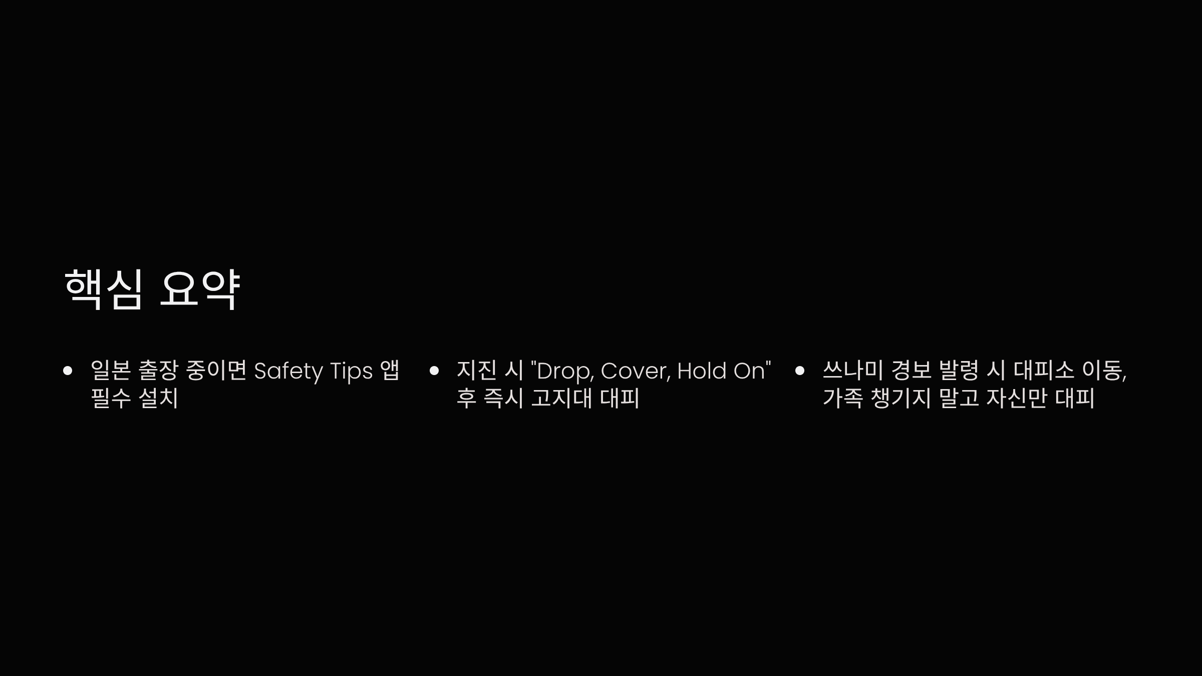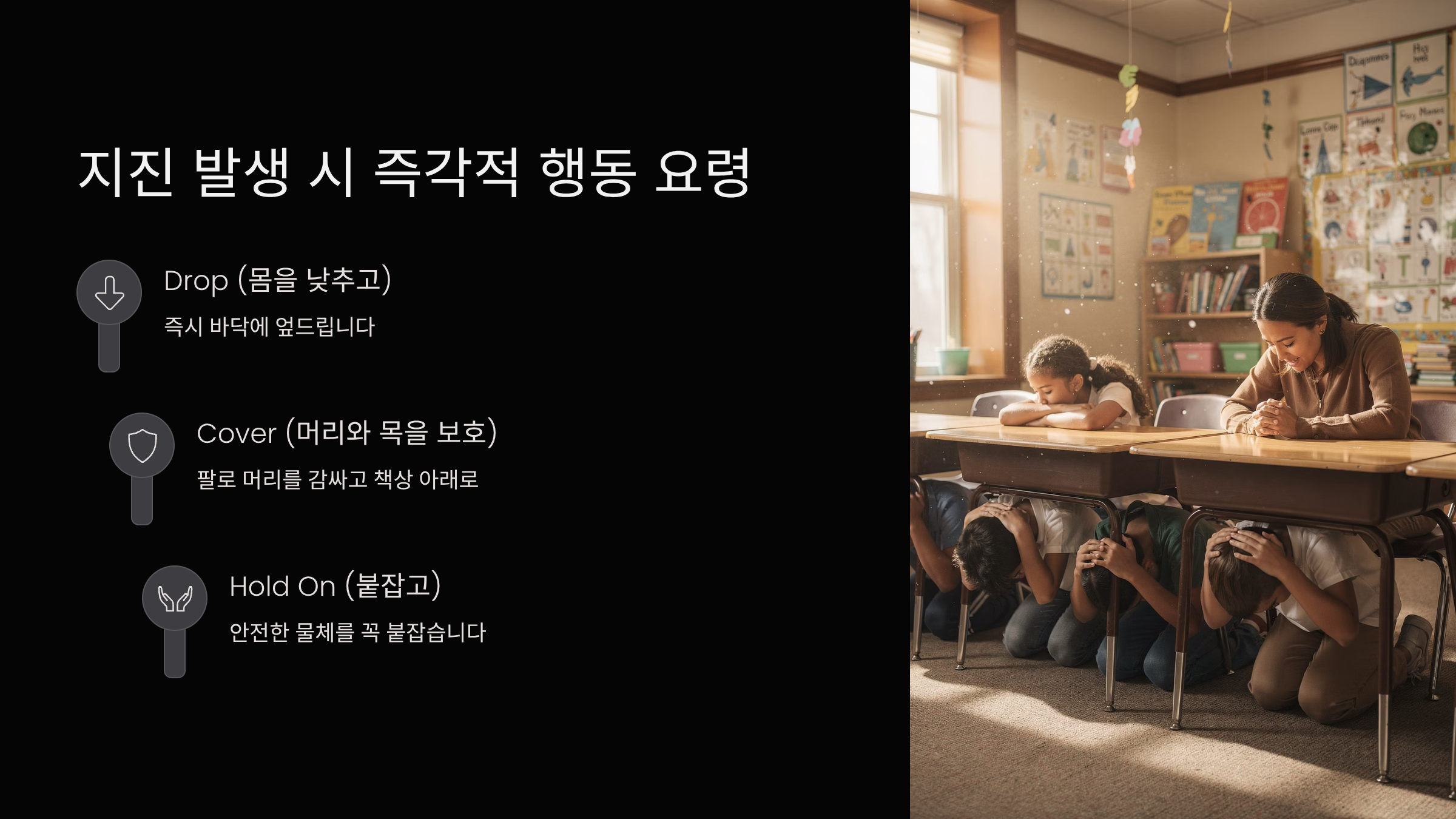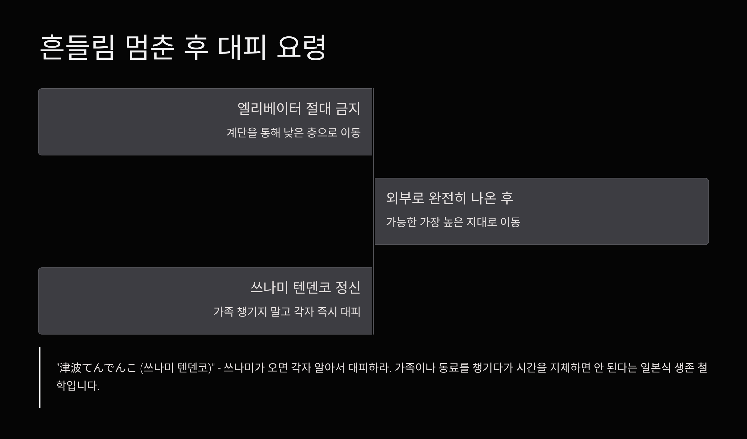 - ✅ 지진 시 "Drop, Cover, Hold On" 후 즉시 고지대 대피