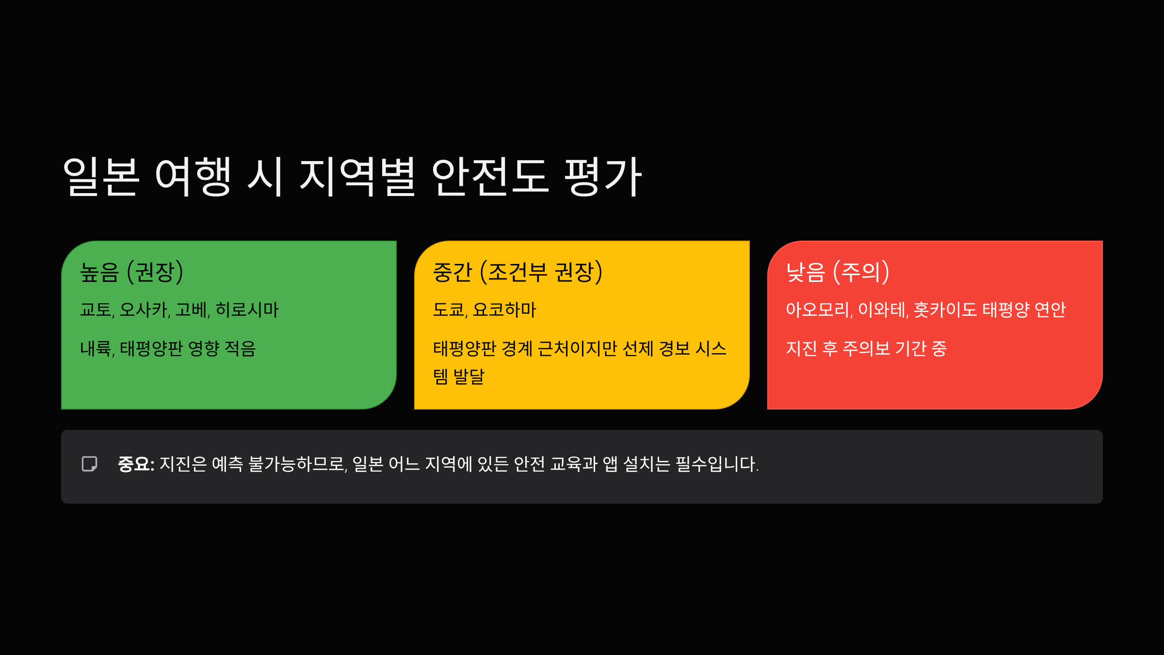 주의: 지진은 예측 불가능하므로, 일본 어느 지역에 있든 안전 교육과 앱 설치는 필수입니다.