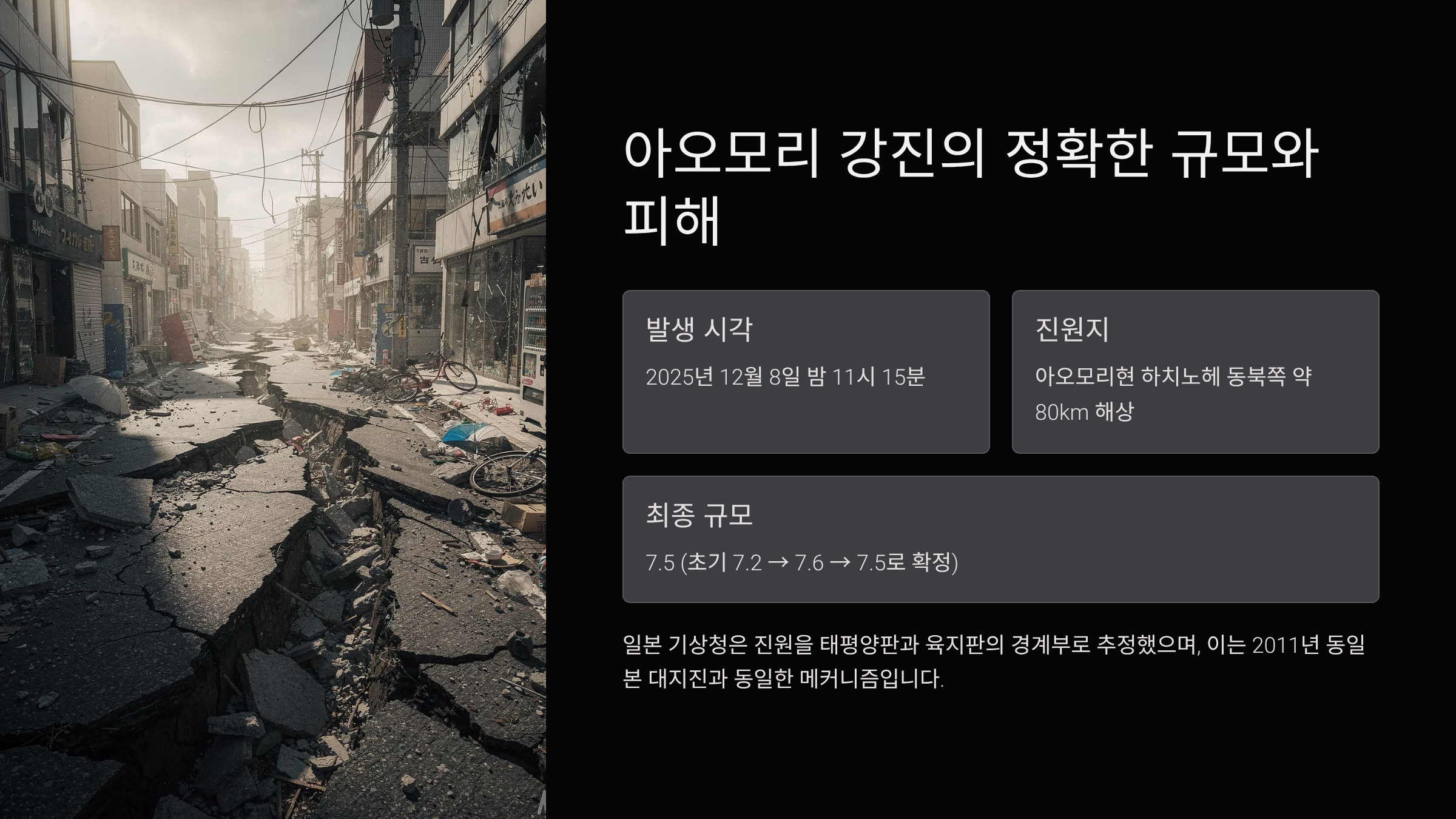 2025년 12월 8일 밤 11시 15분경 아오모리현 하치노헤 동북쪽 약 80km 해상에서 발생한 이번 지진은 초기에 규모 7.2로 발표되었다가 이후 7.6으로 상향 조정되었고, 최종적으로 7.5로 확정되었습니다. 일본 기상청은 진원을 태평양판과 육지판의 경계부로 추정했으며, 이는 2011년 동일본 대지진과 동일한 메커니즘임을 의미합니다.