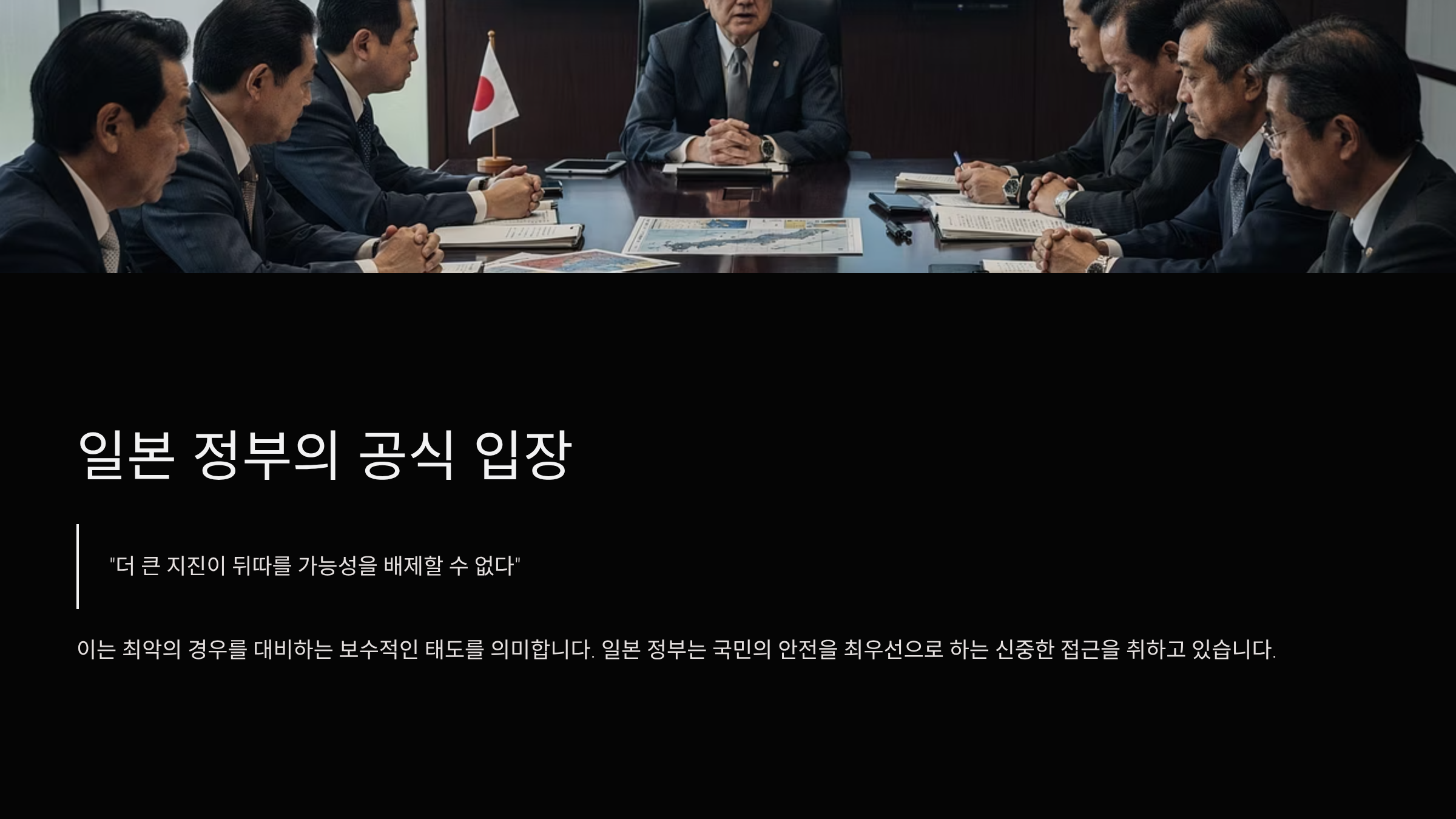 다만 일본 정부의 경고는 명확합니다. "더 큰 지진이 뒤따를 가능성을 배제할 수 없다"는 입장이며, 이는 최악의 경우를 대비하는 보수적인 태도를 의미합니다.