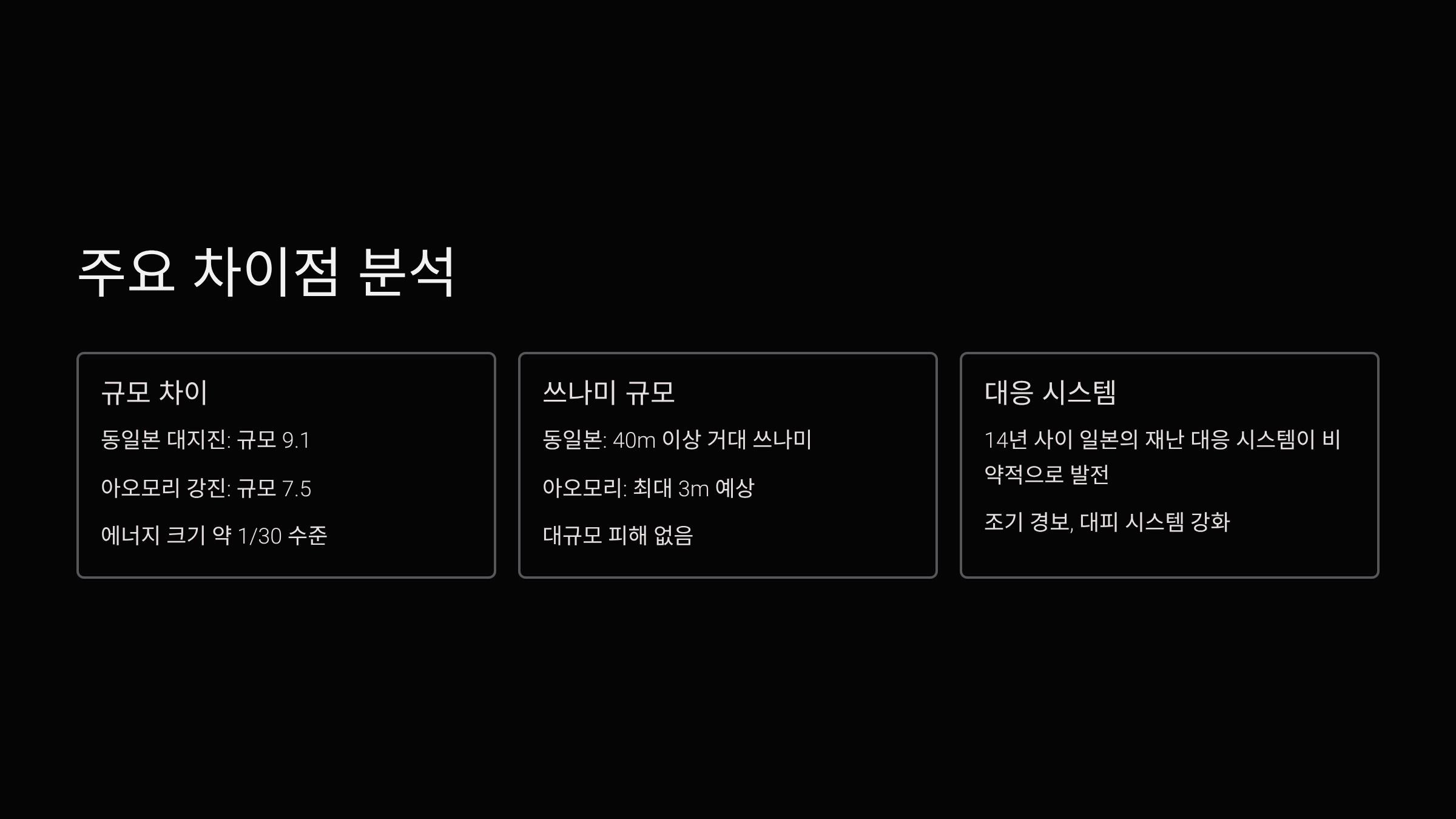 동일본 대지진은 발생 당시부터 규모 9.1의 초대형 지진이었으며, 이로 인해 40m 이상의 거대 쓰나미가 발생해 약 2만 명의 사망자를 냈습니다. 반면 이번 아오모리 강진은 규모 7.5로, 에너지 크기로는 약 1/30 정도 수준입니다. 또한 일본의 재난 대응 시스템이 14년 사이 비약적으로 발전했습니다.