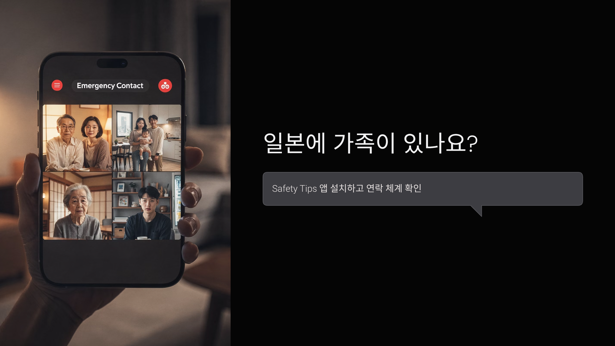 - 일본에 가족이 있나요? → Safety Tips 앱 설치하고 연락 체계 확인