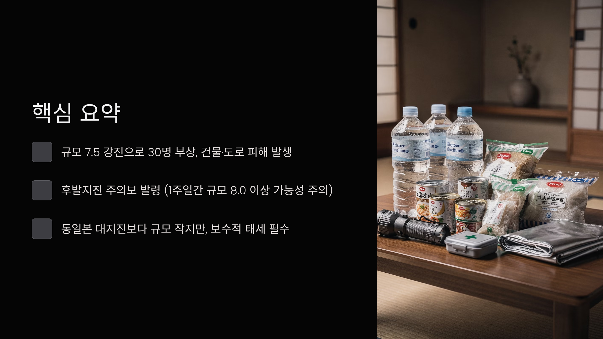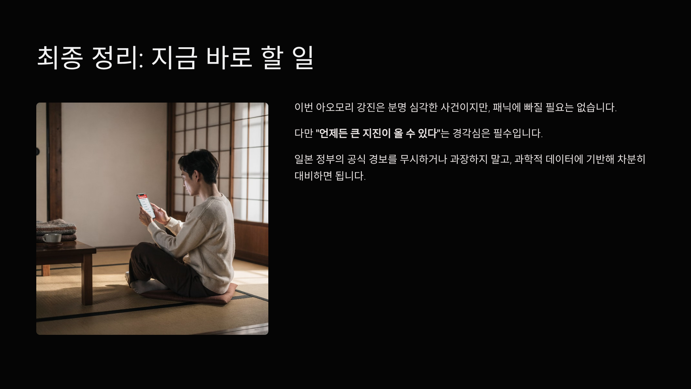 이번 아오모리 강진은 분명 심각한 사건이지만, 패닉에 빠질 필요는 없습니다. 다만 "언제든 큰 지진이 올 수 있다"는 경각심은 필수입니다. 일본 정부의 공식 경보를 무시하거나 과장하지 말고, 과학적 데이터에 기반해 차분히 대비하면 됩니다.