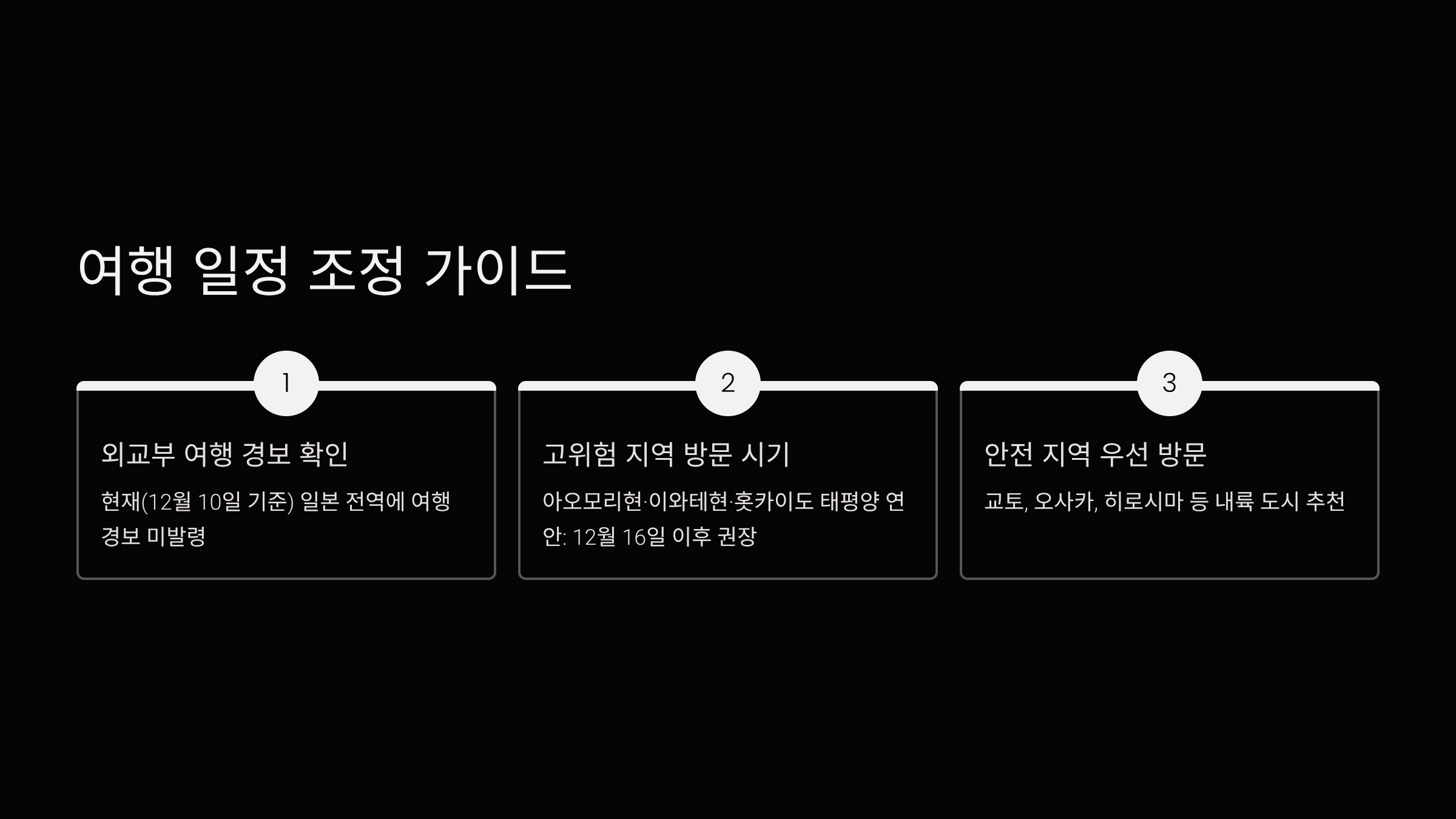 먼저 여행 일정을 조정할 계획이라면, 현재 한국 외교부의 여행 경보 단계를 확인하세요. 현재(12월 10일 기준) 일본 전역에 대해 여행 경보가 발령되지 않았습니다. 단, 아오모리현·이와테현·홋카이도의 태평양 연안 지역을 방문한다면 최소 12월 16일 이후를 권장합니다.