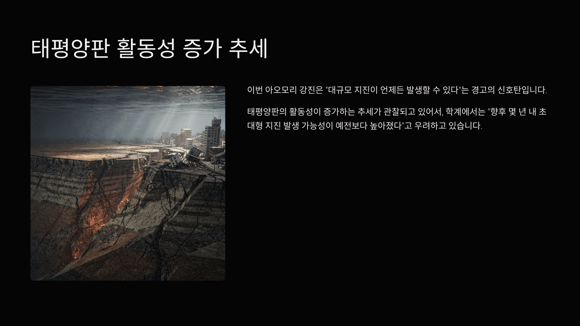난카이 대지진이 발생한다면 예상 사망자는 약 6만 명에서 최악의 경우 20만 명에 이를 것으로 추정되고 있습니다. 이번 아오모리 강진은 "대규모 지진이 언제든 발생할 수 있다"는 경고의 신호탄인 셈입니다. 특히 태평양판의 활동성이 증가하는 추세가 관찰되고 있어서, 학계에서는 "향후 몇 년 내 초대형 지진 발생 가능성이 예전보다 높아졌다"고 우려하고 있습니다.