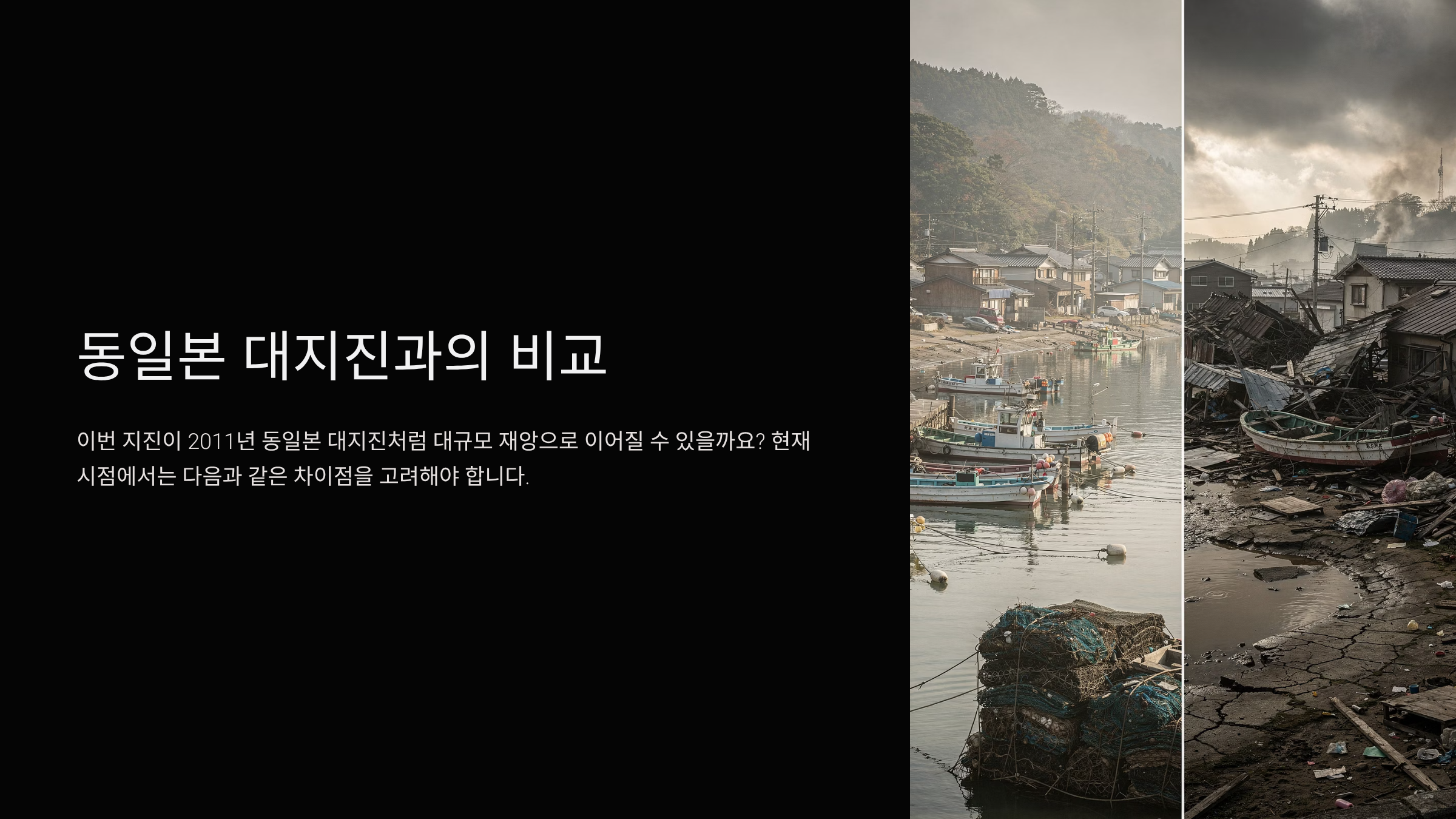 혹시 이번 지진이 2011년 동일본 대지진(규모 9.1)처럼 대규모 재앙으로 이어질 수 있다는 생각에 불안해하시는 분들이 있을 겁니다. 하지만 현재 시점에서는 다음과 같은 차이점을 고려해야 합니다.