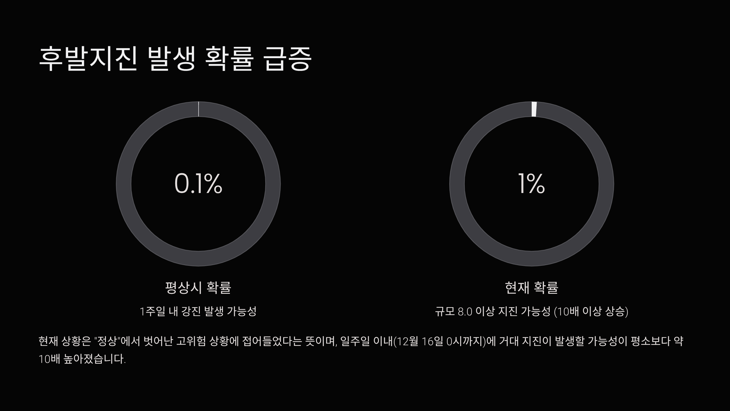 - ✅ 후발지진 주의보 발령 (1주일간 규모 8.0 이상 가능성 주의)