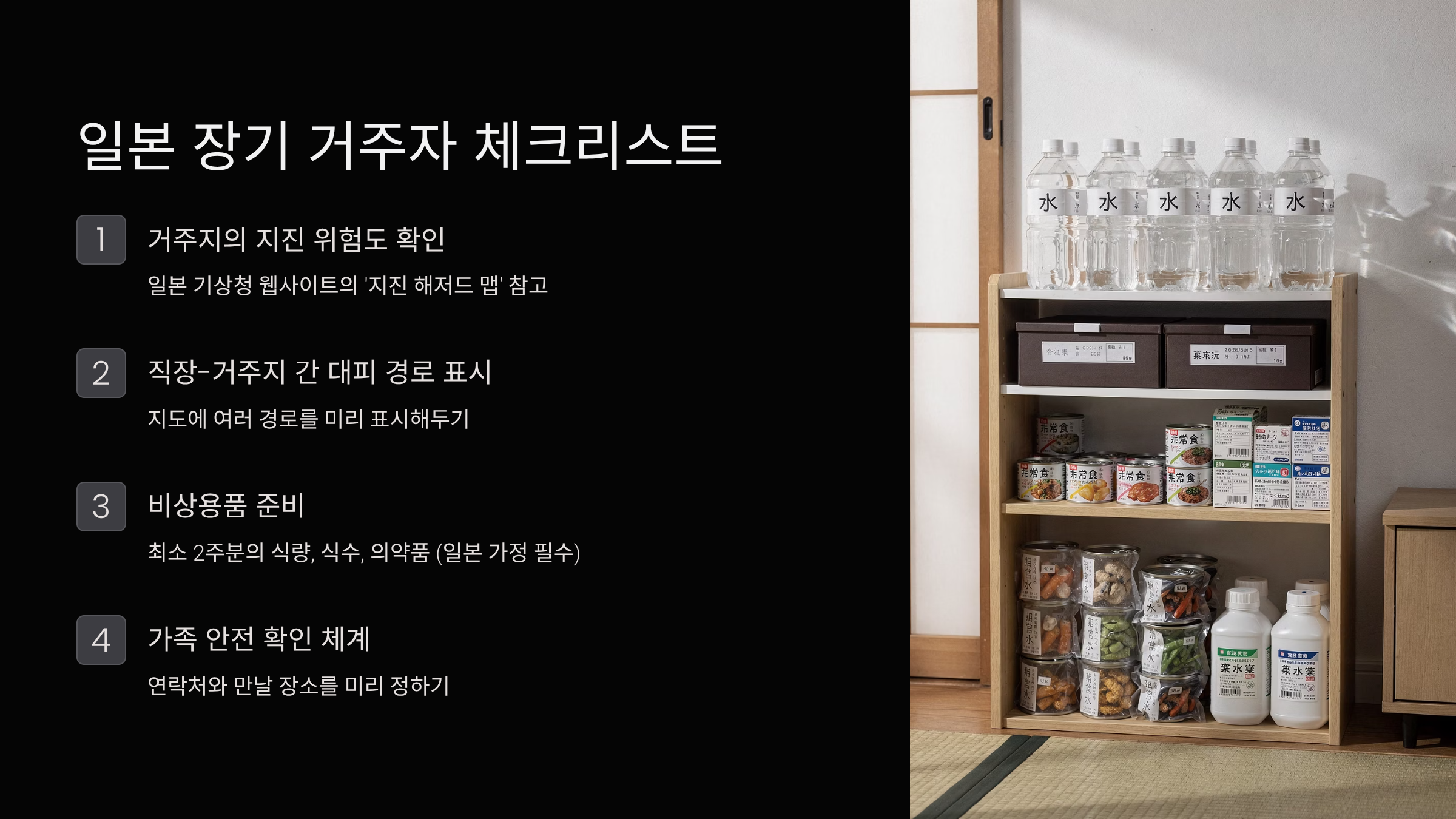 일본에 장기 거주하고 있다면, 지금 바로 다음을 체크하세요. 첫째, 거주지의 지진 위험도를 확인합니다(일본 기상청 웹사이트의 '지진 해저드 맵' 참고). 둘째, 직장과 거주지 간 대피 경로를 표시한 지도를 준비합니다. 셋째, 최소 2주분의 식량과 식수, 의약품을 비상용으로 준비합니다(일본 가정에서는 필수). 넷째, 가족 간 안전 확인 연락처와 만날 장소를 미리 정합니다.