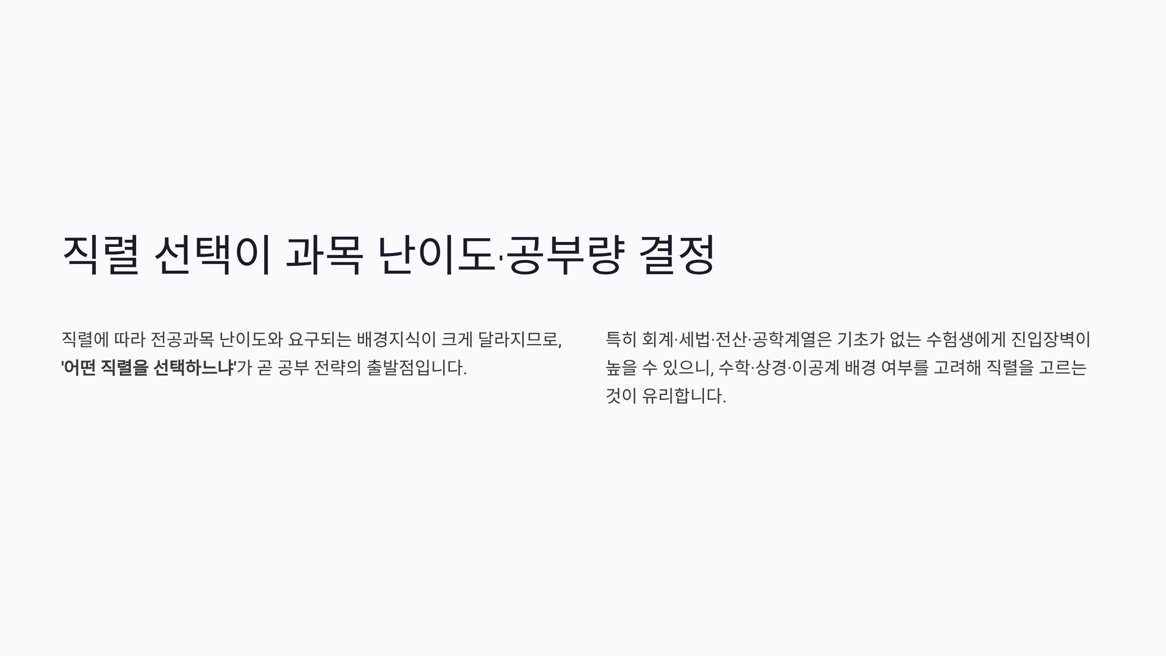 특히 회계·세법·전산·공학계열은 기초가 없는 수험생에게 진입장벽이 높을 수 있으니, 수학·상경·이공계 배경 여부를 고려해 직렬을 고르는 것이 유리합니다.
