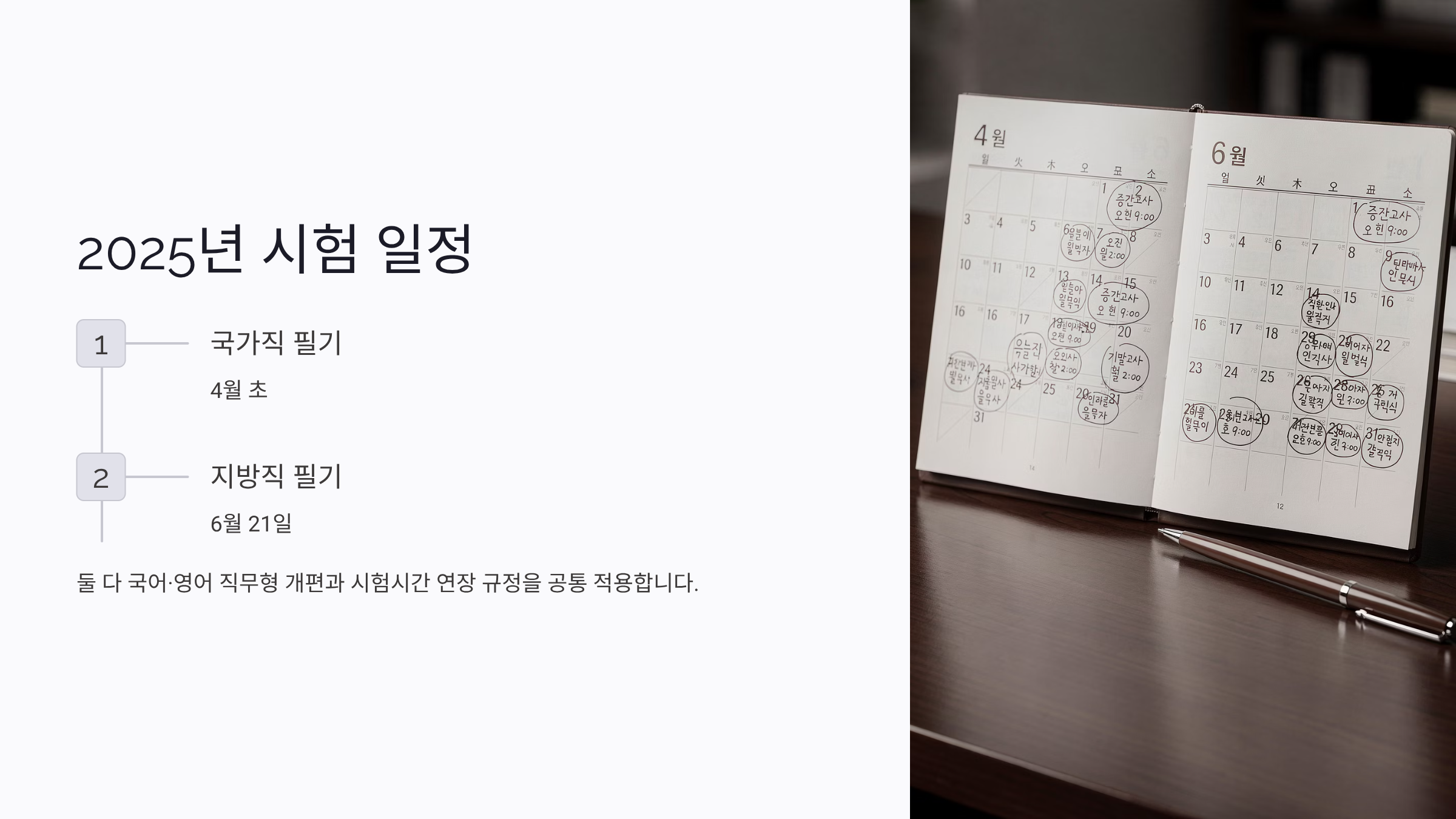 2025년 기준 국가직 필기는 4월 초, 지방직 필기는 6월 21일 실시되며, 둘 다 국어·영어 직무형 개편과 시험시간 연장 규정을 공통 적용합니다.