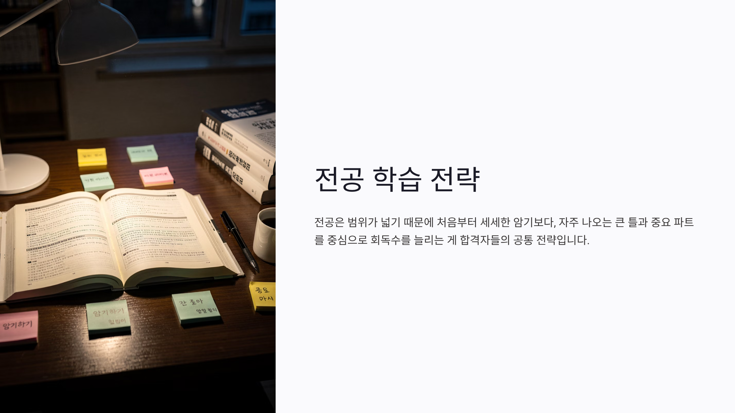 전공은 범위가 넓기 때문에 처음부터 세세한 암기보다, 자주 나오는 큰 틀과 중요 파트를 중심으로 회독수를 늘리는 게 합격자들의 공통 전략입니다.