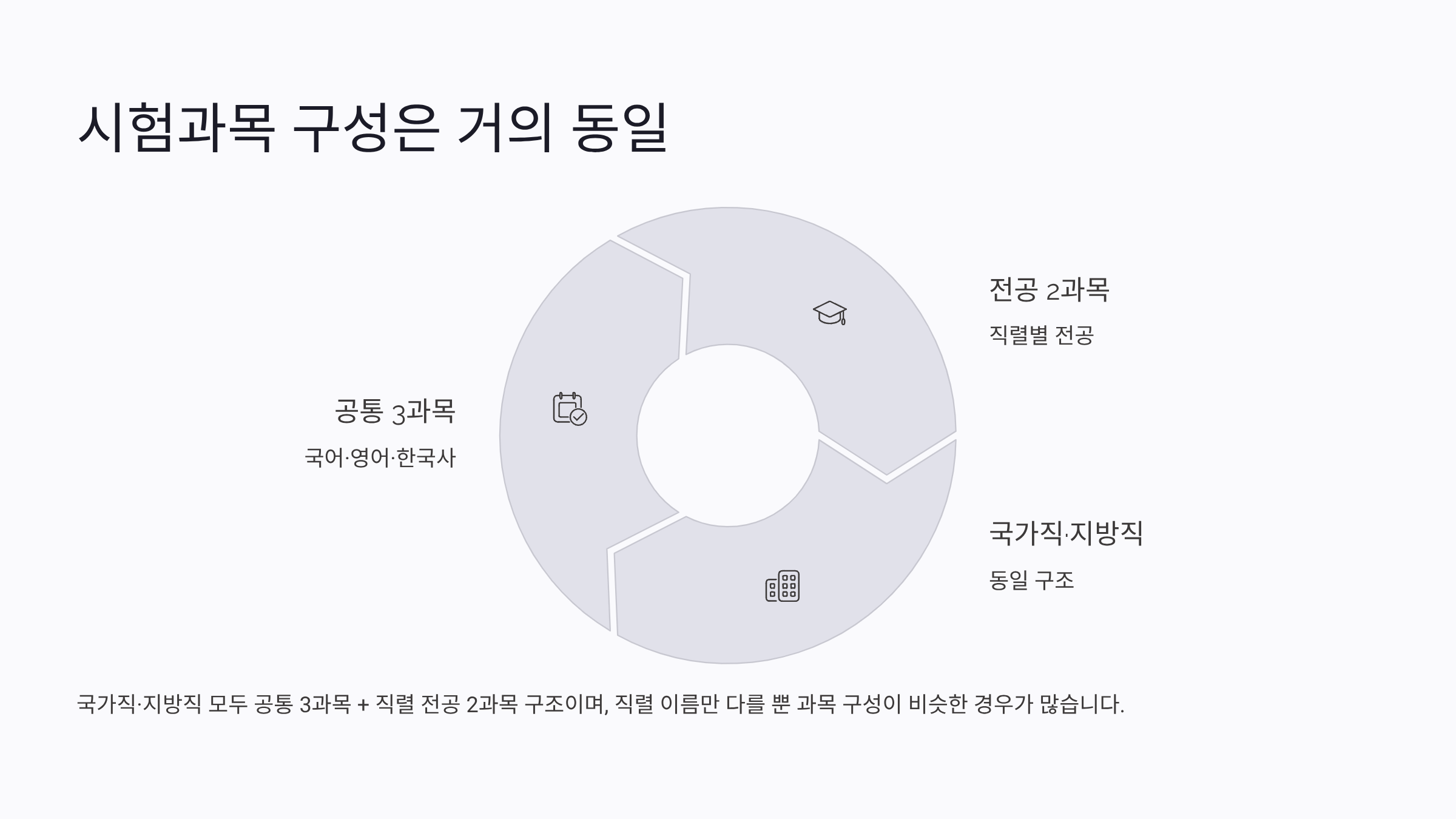 국가직·지방직 모두 공통 3과목 + 직렬 전공 2과목 구조이며, 직렬 이름만 다를 뿐 과목 구성이 비슷한 경우가 많습니다.