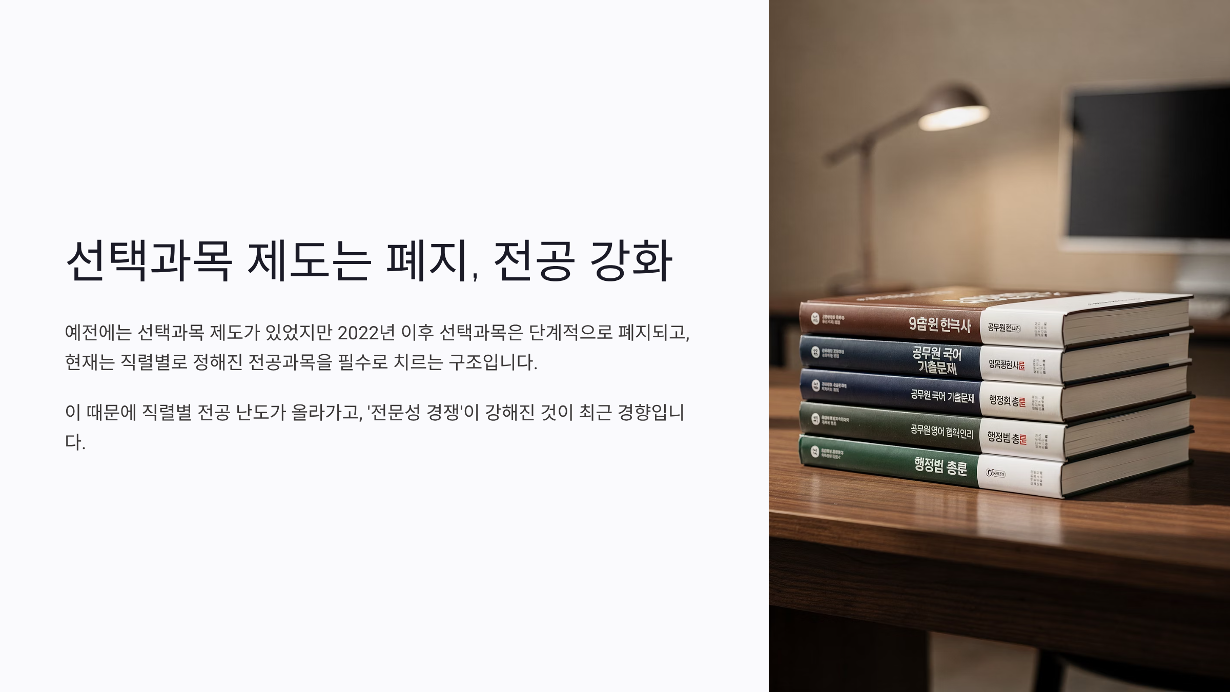 예전에는 선택과목 제도가 있었지만 2022년 이후 선택과목은 단계적으로 폐지되고, 현재는 직렬별로 정해진 전공과목을 필수로 치르는 구조입니다.