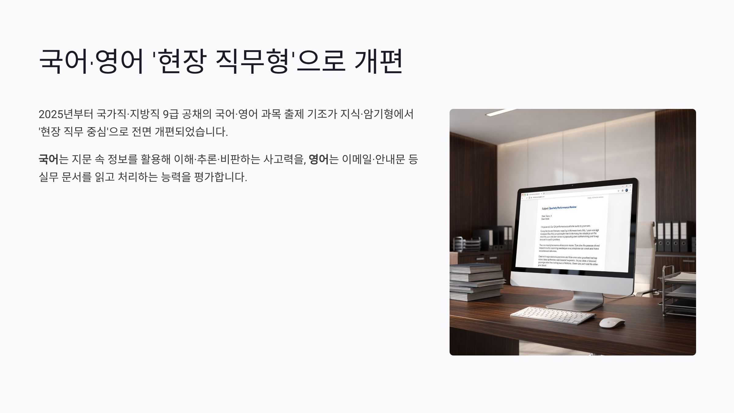 2025년부터 국가직·지방직 9급 공채의 국어·영어 과목 출제 기조가 지식·암기형에서 '현장 직무 중심'으로 전면 개편되었습니다.