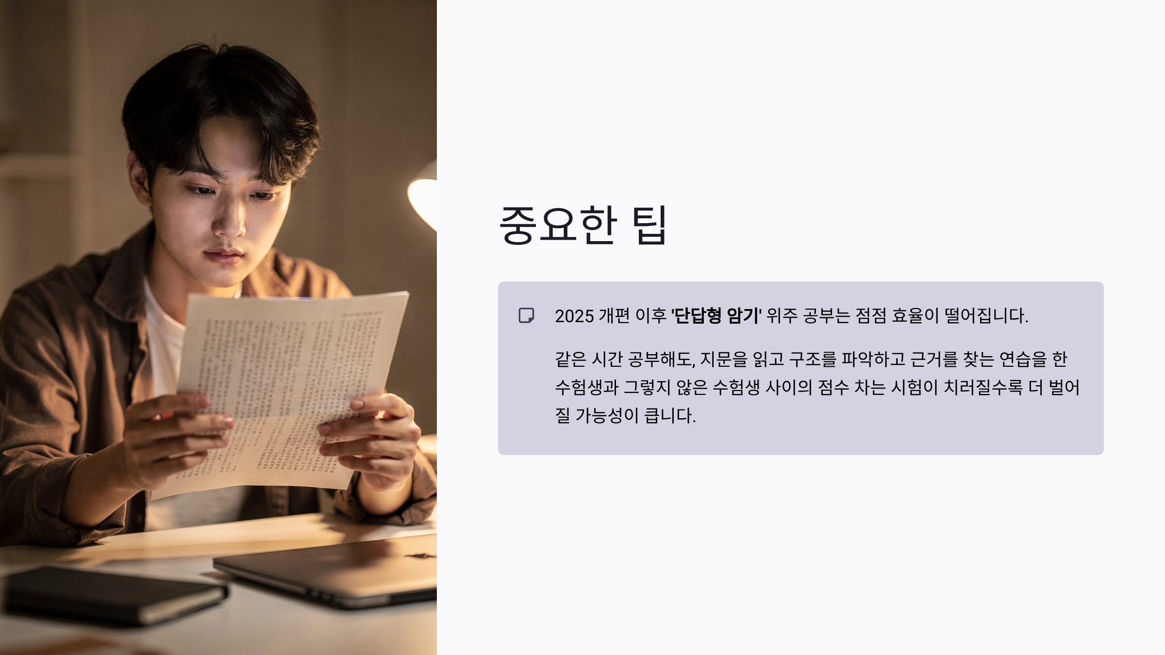 2025 개편 이후 '단답형 암기' 위주 공부는 점점 효율이 떨어집니다.