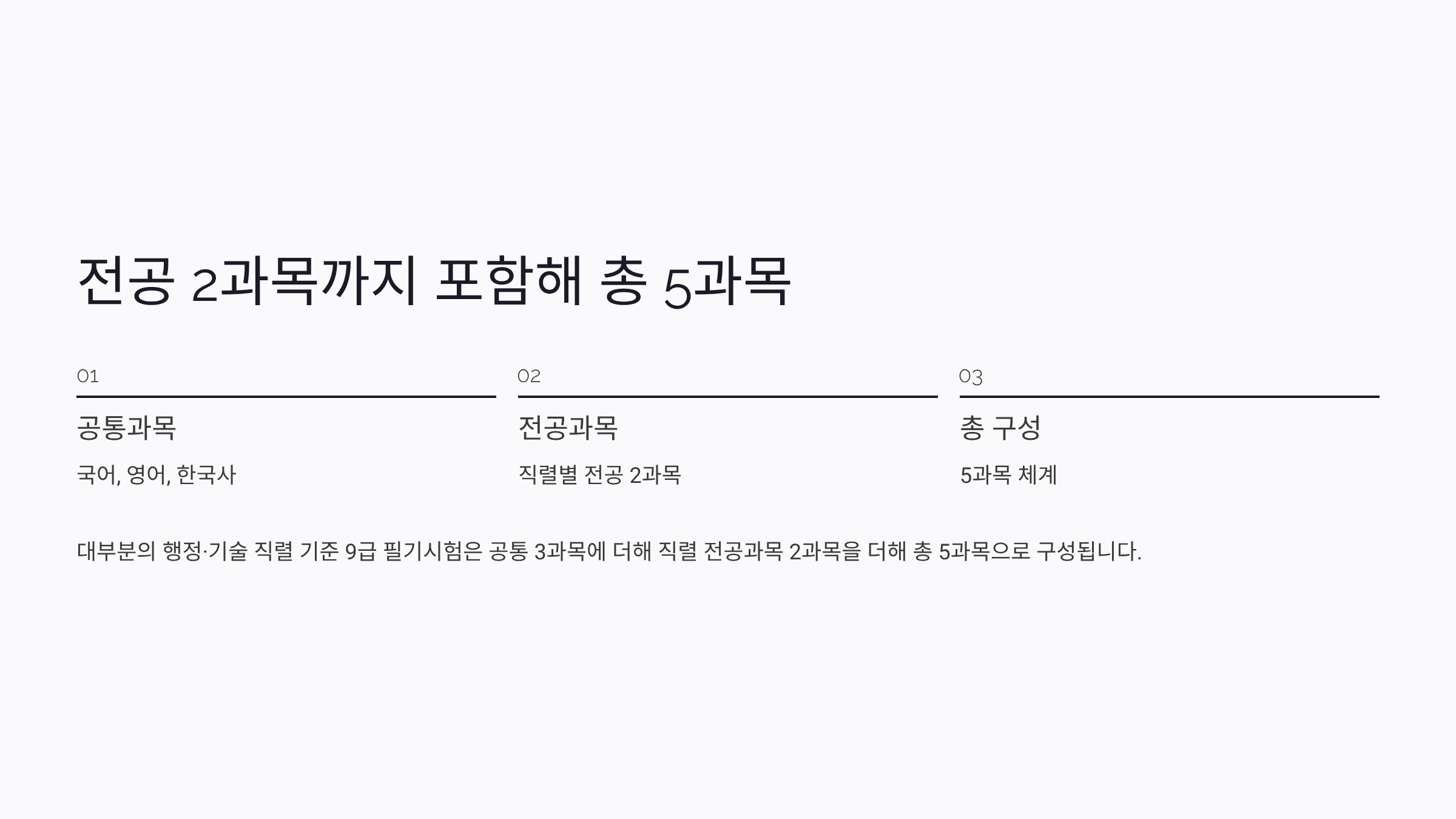1 9급은 공통 3과목 국어·영어·한국사 + 직렬 전공 2과목, 총 5과목 구조입니다.