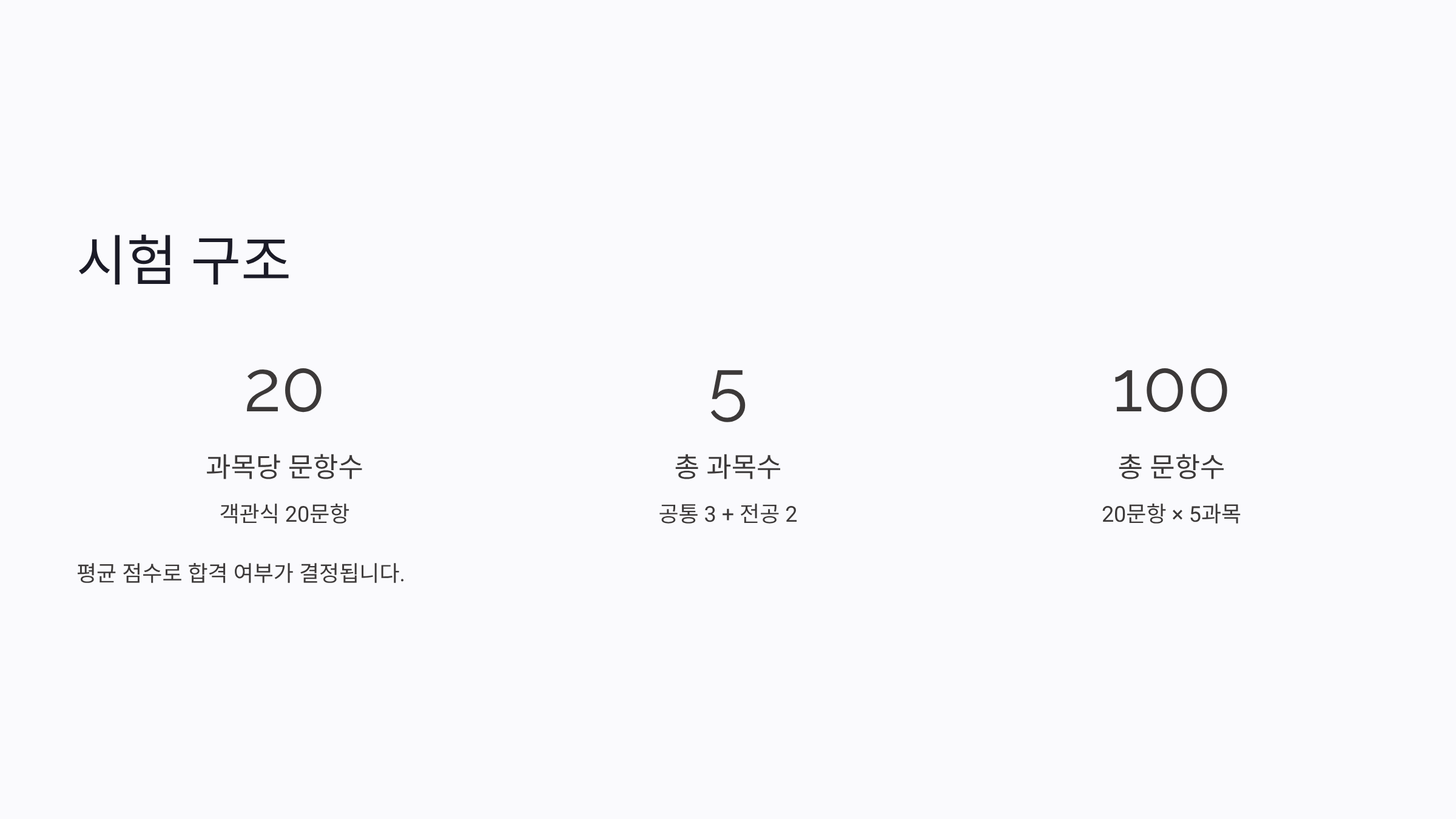 각 과목 20문항 객관식, 과목당 20문항×5과목=100문항이며, 평균 점수로 합격 여부가 결정됩니다.