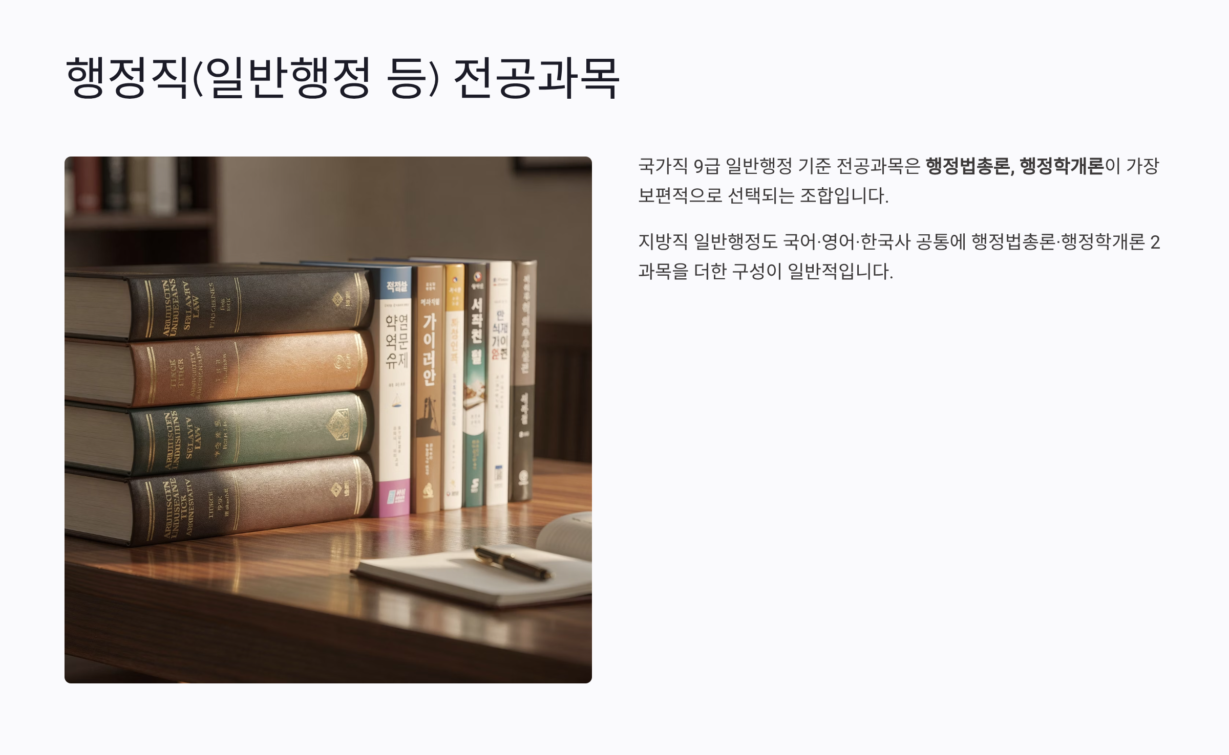 예를 들어 국가직 일반행정과 지방직 일반행정은 동일한 과목 조합(국어·영어·한국사·행정법·행정학)으로 준비하는 것이 보통입니다.