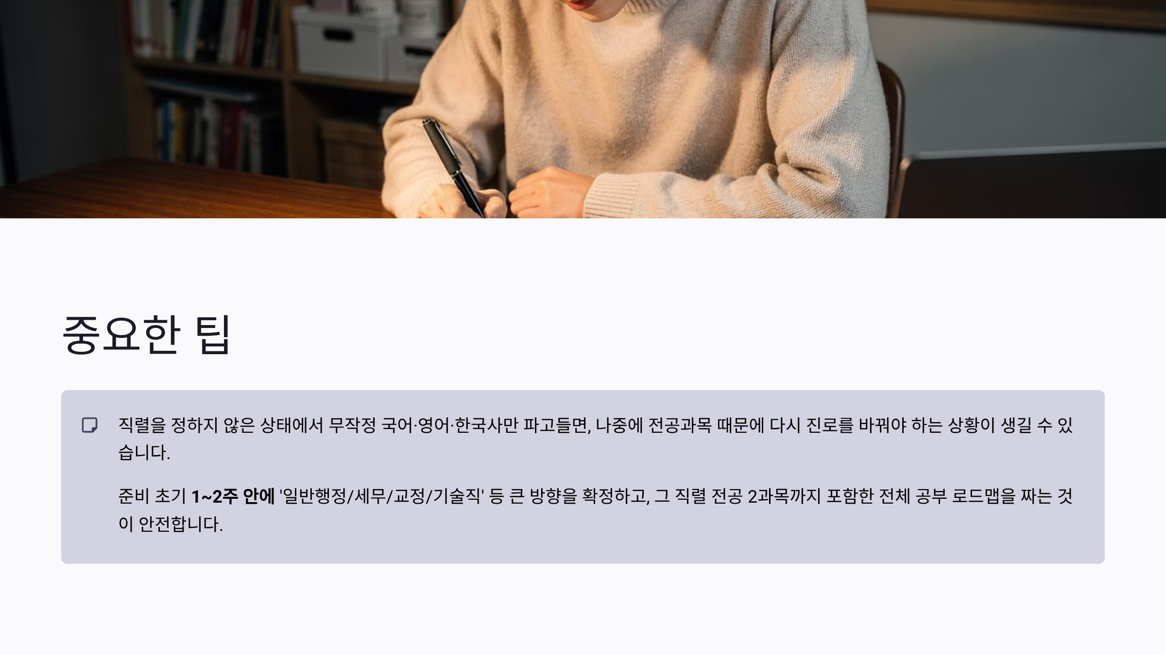 직렬을 정하지 않은 상태에서 무작정 국어·영어·한국사만 파고들면, 나중에 전공과목 때문에 다시 진로를 바꿔야 하는 상황이 생길 수 있습니다.