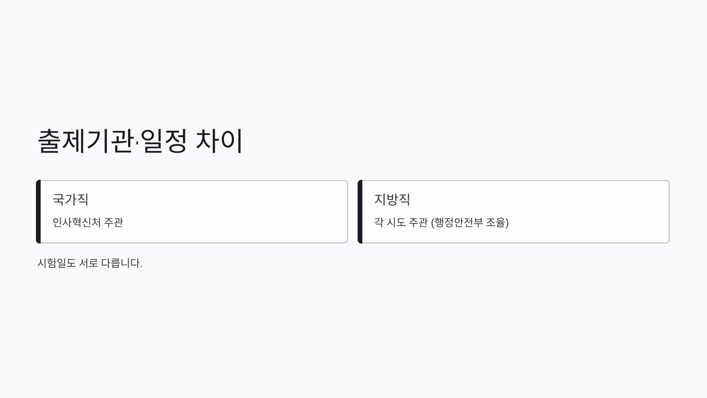 국가직은 인사혁신처, 지방직은 각 시도(행정안전부가 일정 조율)에서 시행하며 시험일도 서로 다릅니다.