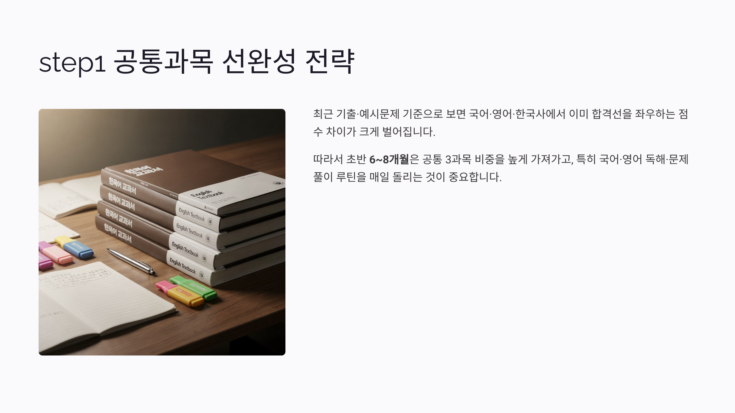 따라서 초반 6~8개월은 공통 3과목 비중을 높게 가져가고, 특히 국어·영어 독해·문제풀이 루틴을 매일 돌리는 것이 중요합니다.