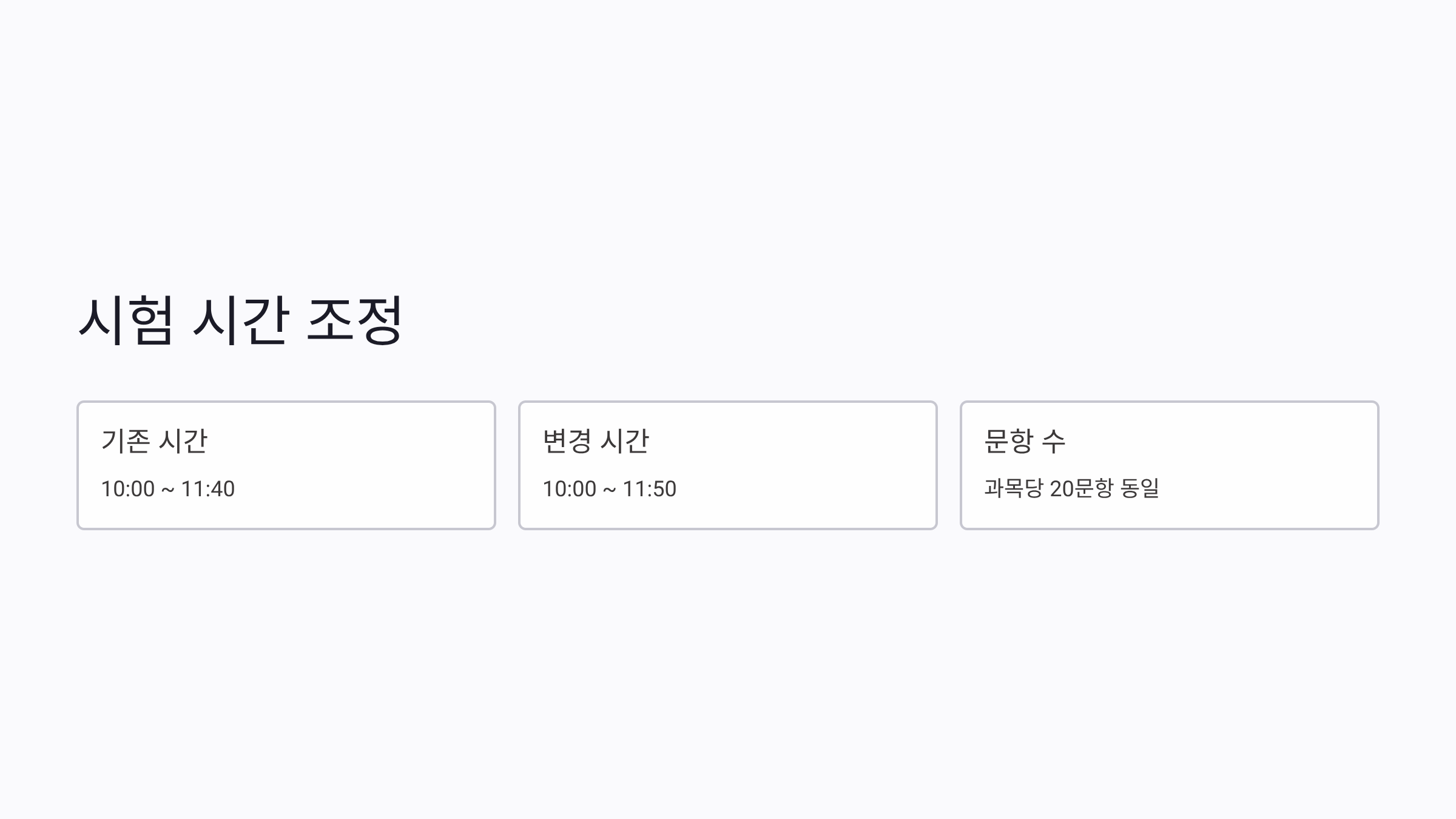시간은 10:00~11:40에서 10:00~11:50로 조정되었고, 문항 수는 과목당 20문항으로 기존과 동일합니다.