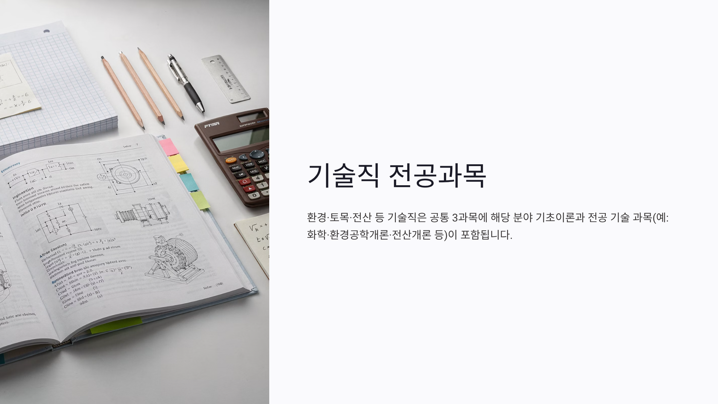 환경·토목·전산 등 기술직은 공통 3과목에 해당 분야 기초이론과 전공 기술 과목(예 화학·환경공학개론·전산개론 등)이 포함됩니다.