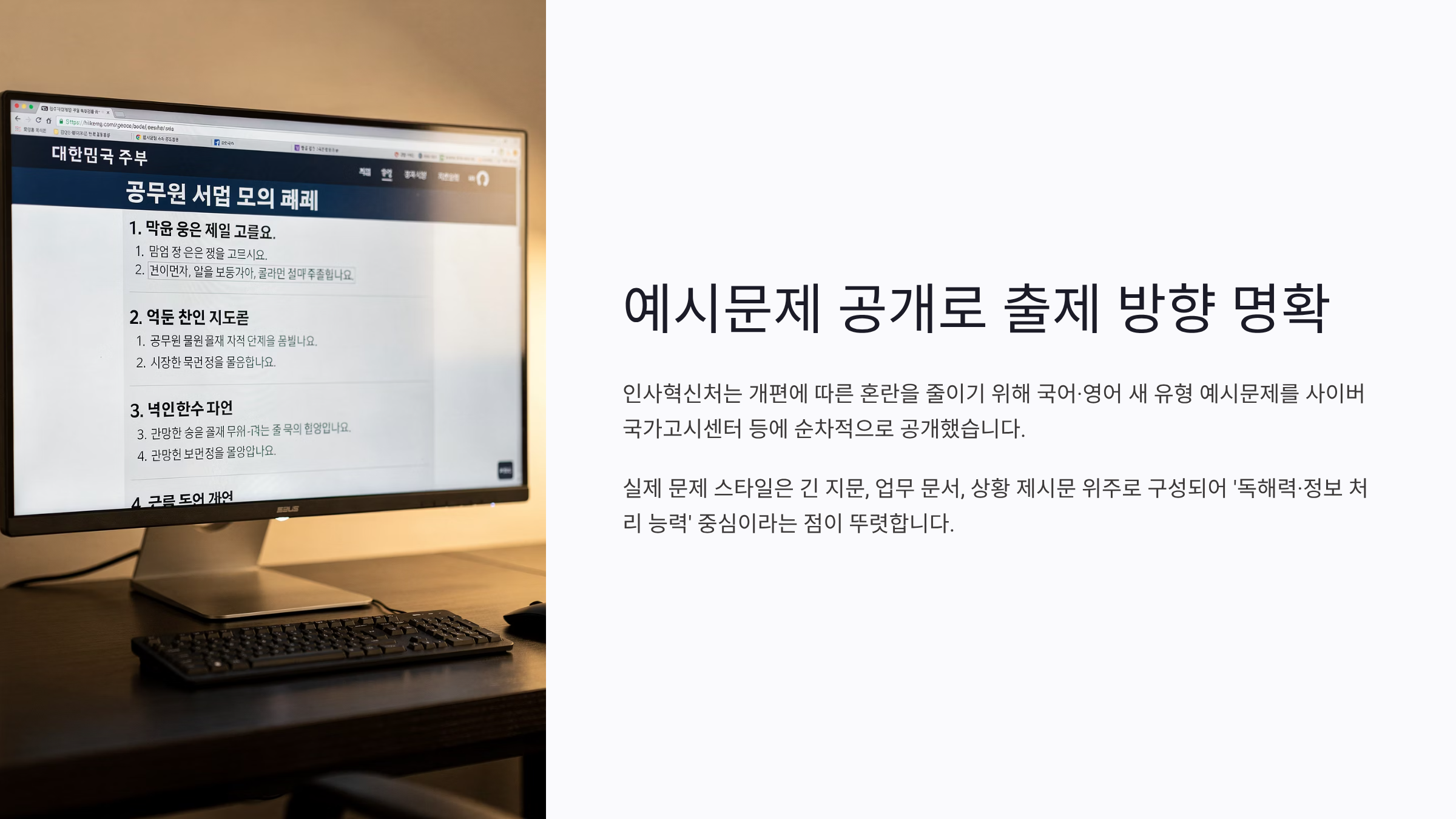 3 인사혁신처 예시문제를 반드시 확인하고 '독해·실무 문서 처리' 중심으로 대비해야 합니다.