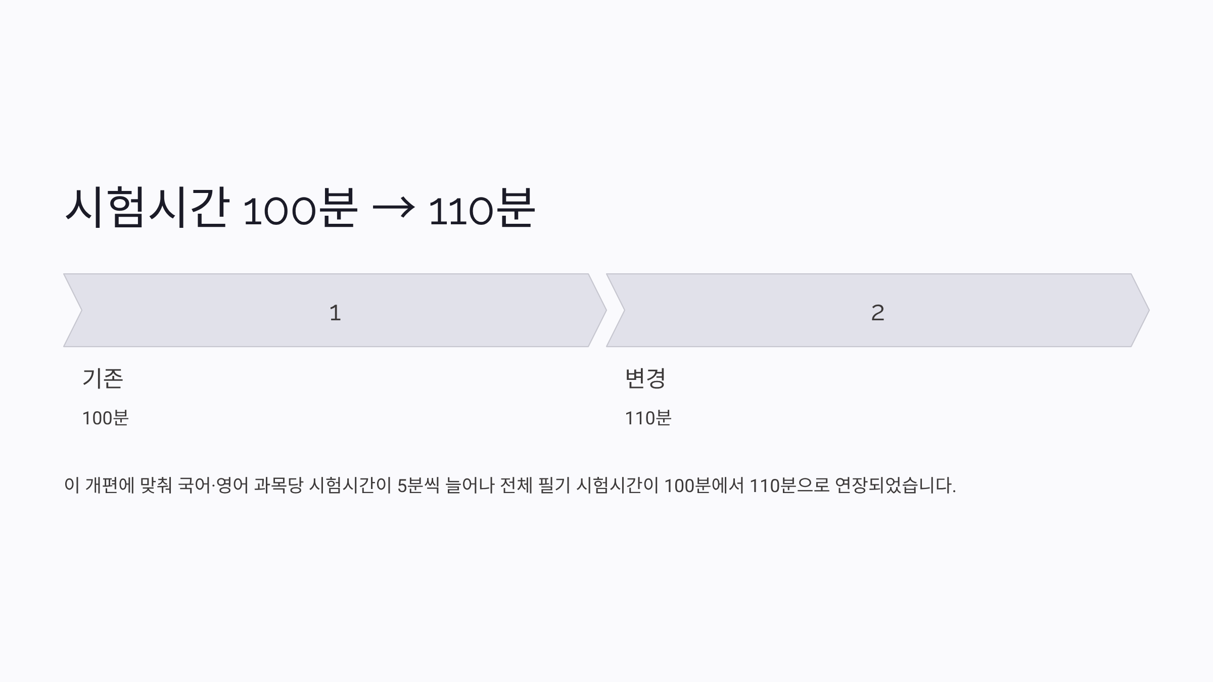 이 개편에 맞춰 국어·영어 과목당 시험시간이 5분씩 늘어나 전체 필기 시험시간이 100분에서 110분으로 연장되었습니다.