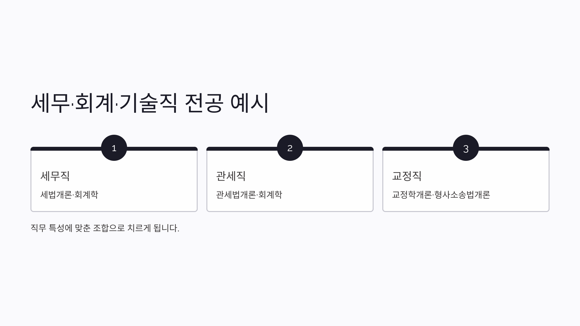 세무직은 세법개론·회계학, 관세직은 관세법개론·회계학, 교정직은 교정학개론·형사소송법개론 등 직무 특성에 맞춘 조합으로 치르게 됩니다.