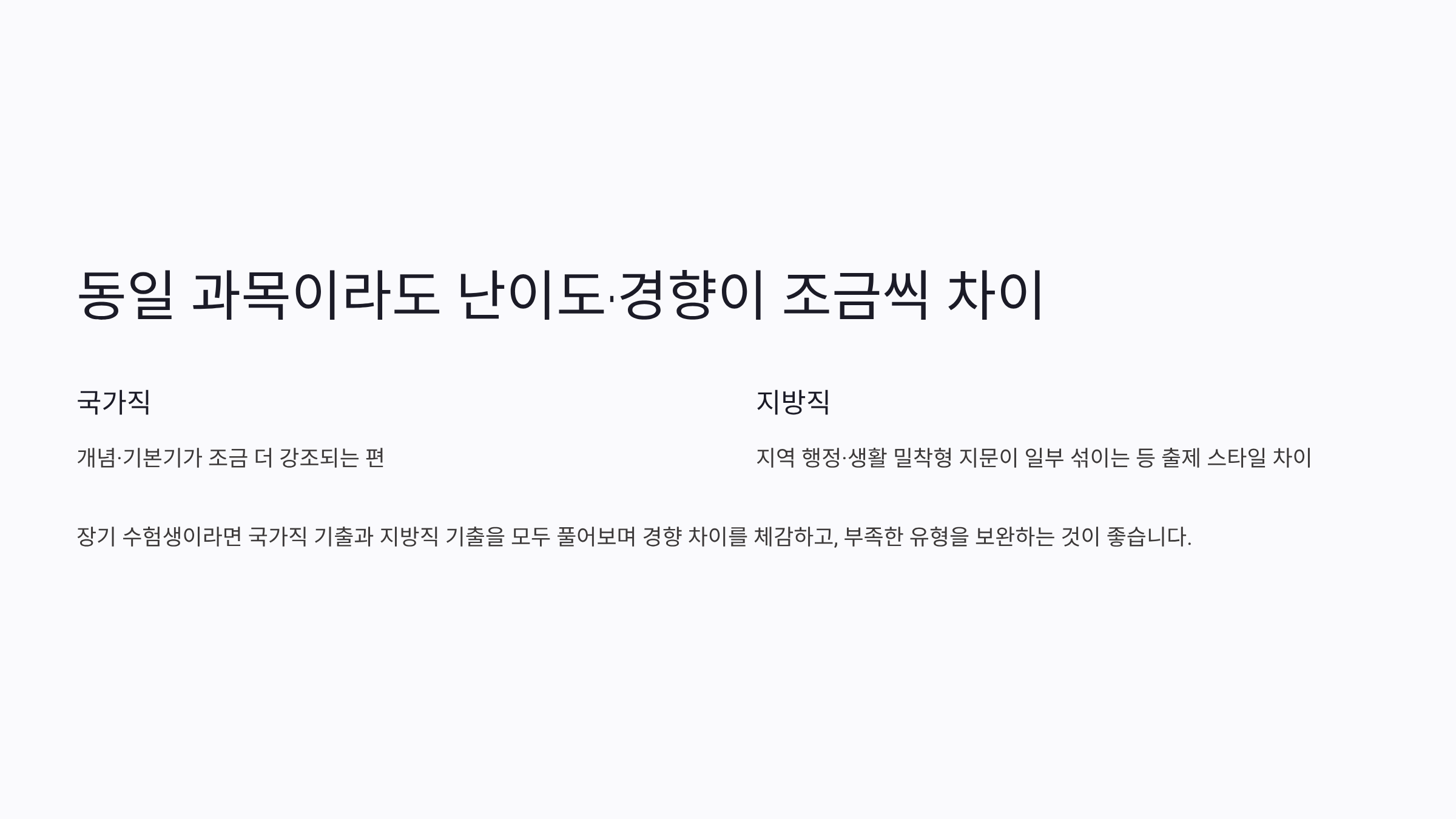 같은 과목이라도 국가직은 개념·기본기가 조금 더 강조되는 편, 지방직은 지역 행정·생활 밀착형 지문이 일부 섞이는 등 출제 스타일에 미세한 차이가 있습니다.