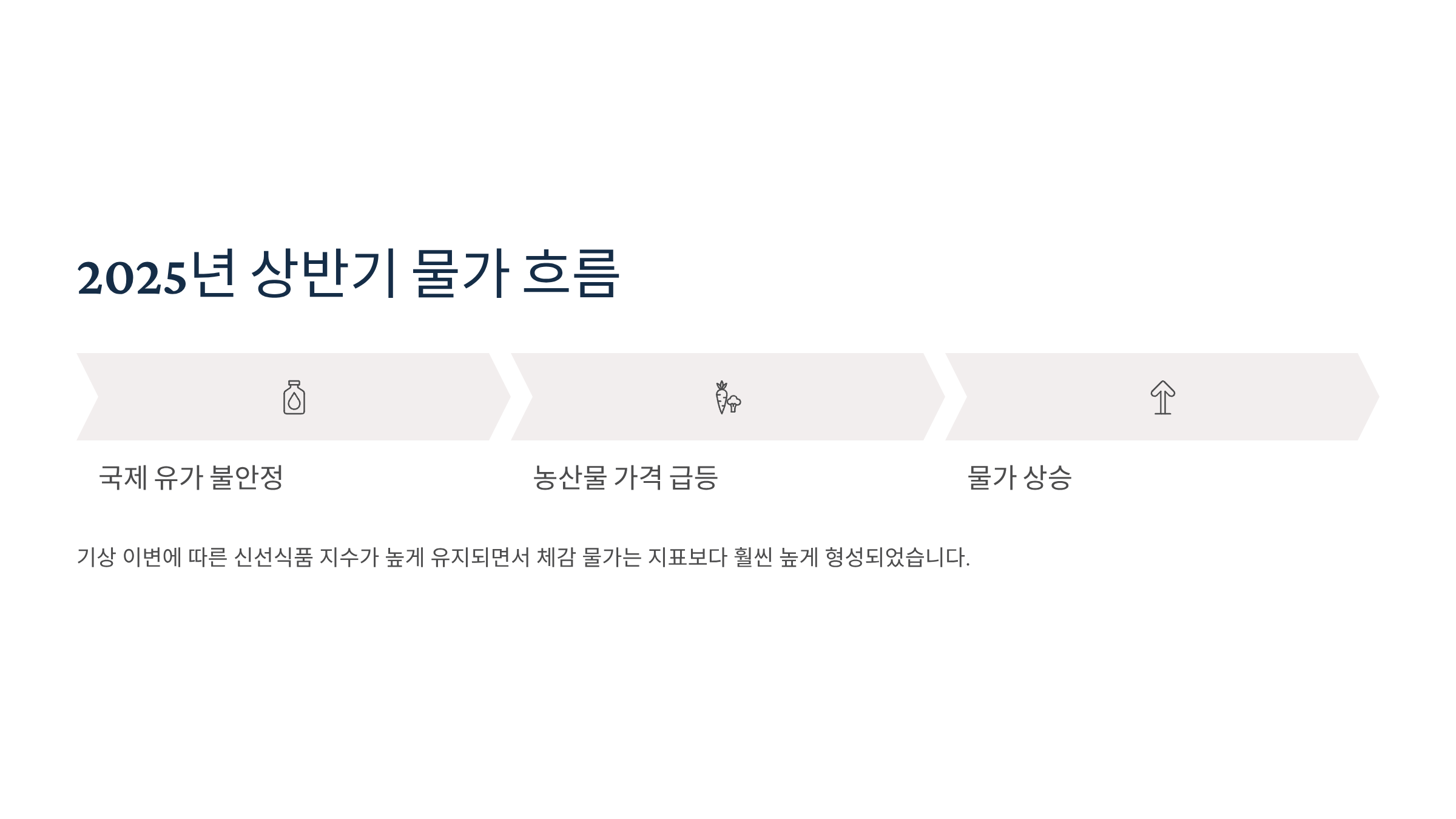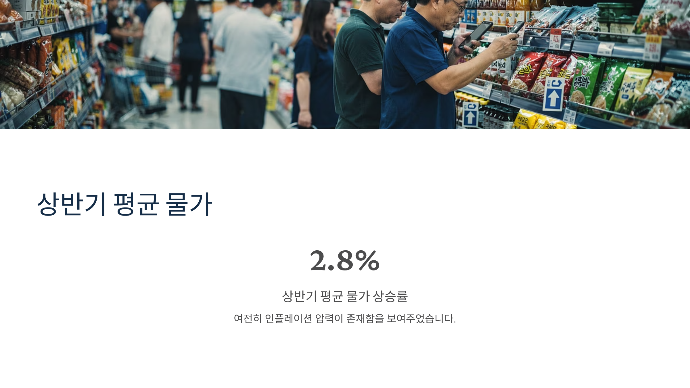 2025년 상반기는 국제 유가 불안정과 기상 이변에 따른 농산물 가격 급등으로 인해 물가가 다소 들썩였습니다. 특히 신선식품 지수가 높게 유지되면서 체감 물가는 지표보다 훨씬 높게 형성되었습니다. 상반기 평균 물가 상승률은 2.0% 후반대를 기록하며 여전히 인플레이션 압력이 존재함을 보여주었습니다.