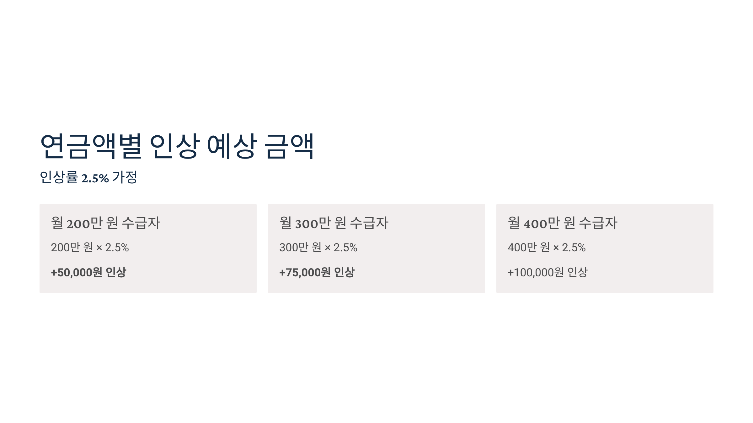 월 400만 원 수급자: 400만 원 × 2.5% = +100,000원 인상