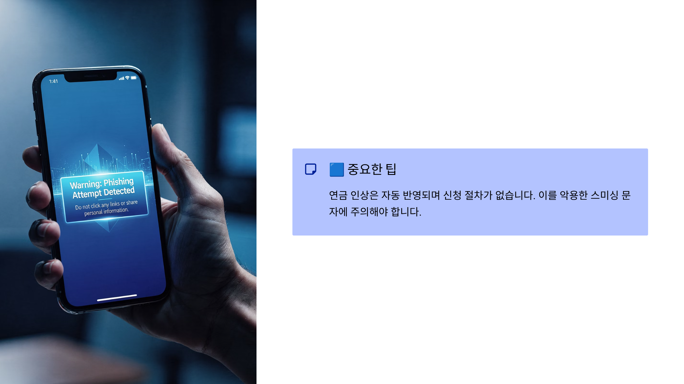 연금 인상은 자동 반영되며 신청 절차가 없습니다. 이를 악용한 스미싱 문자에 주의해야 합니다.