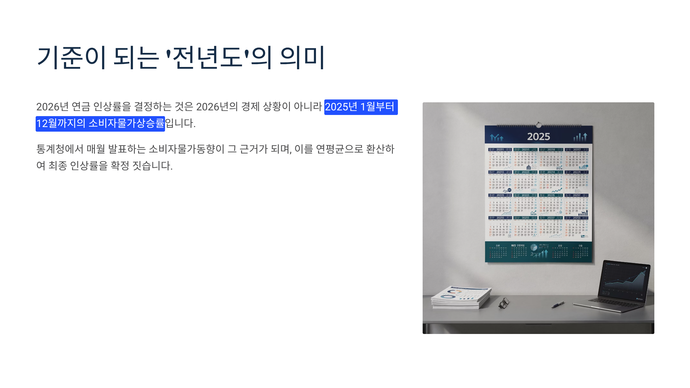 2026년 연금 인상률을 결정하는 것은 2026년의 경제 상황이 아니라 2025년 1월부터 12월까지의 소비자물가상승률입니다. 통계청에서 매월 발표하는 소비자물가동향이 그 근거가 되며, 이를 연평균으로 환산하여 최종 인상률을 확정 짓습니다.