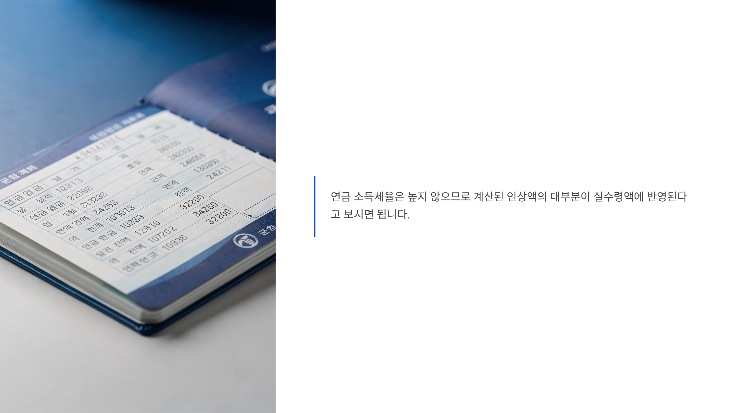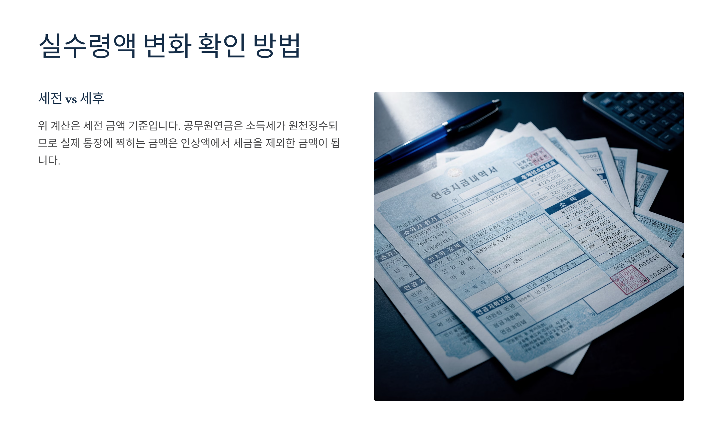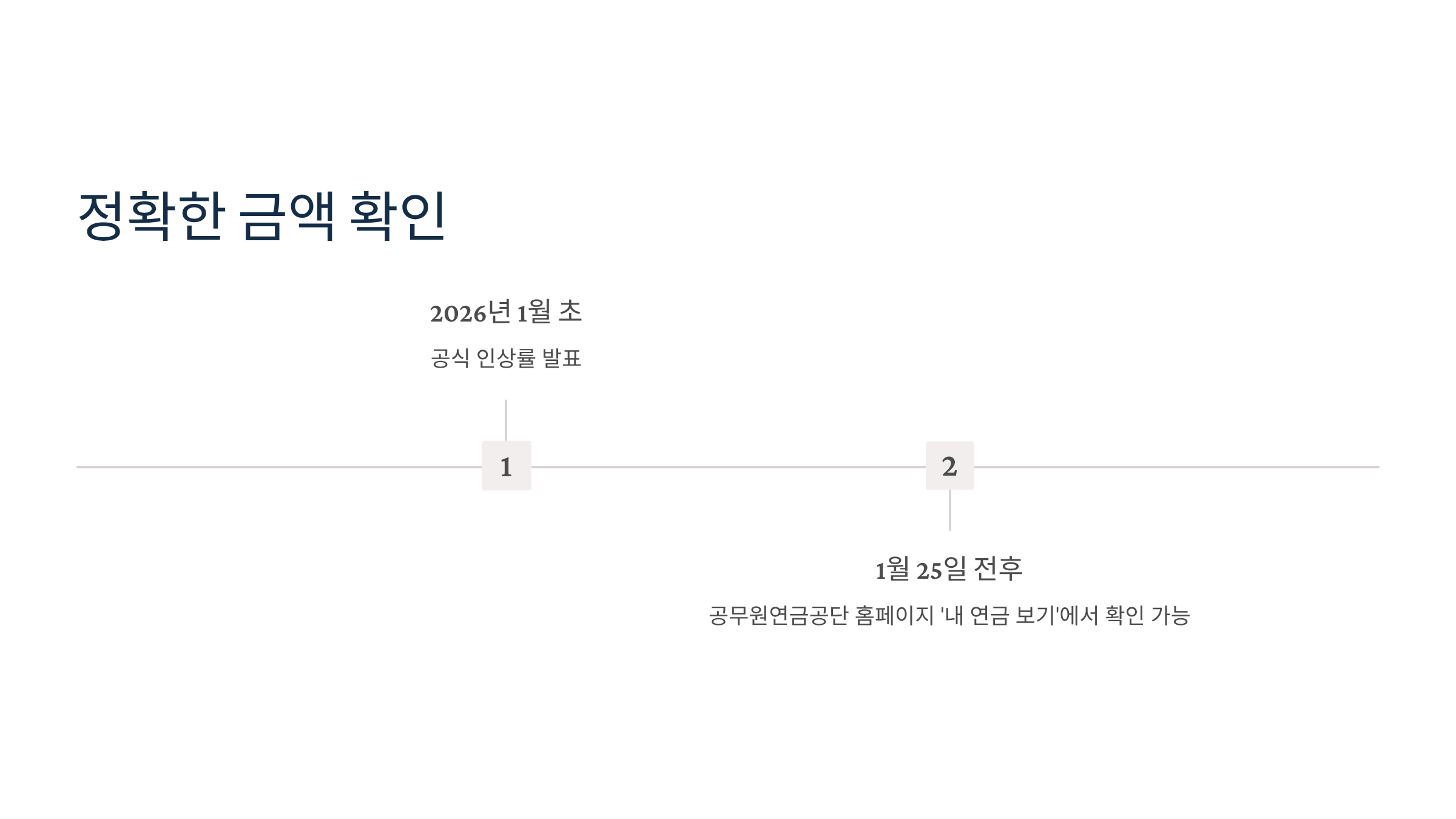 위 계산은 세전 금액 기준입니다. 공무원연금은 소득세가 원천징수되므로 실제 통장에 찍히는 금액은 인상액에서 세금을 제외한 금액이 됩니다. 하지만 연금 소득세율은 높지 않으므로 계산된 인상액의 대부분이 실수령액에 반영된다고 보시면 됩니다. 정확한 금액은 2026년 1월 25일 전후로 공무원연금공단 홈페이지 '내 연금 보기'에서 확인 가능합니다.