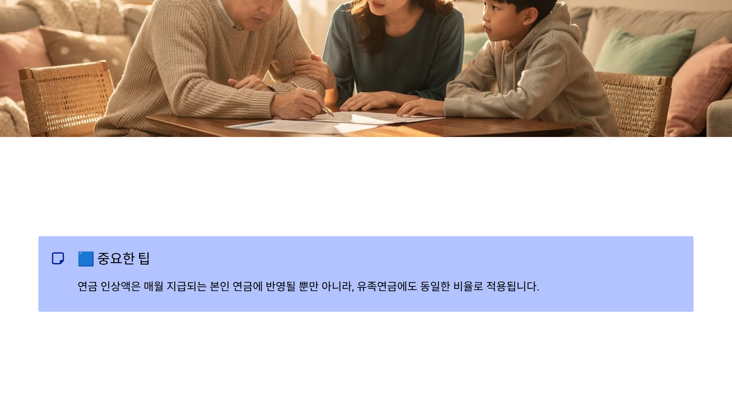 연금 인상액은 매월 지급되는 본인 연금에 반영될 뿐만 아니라, 유족연금에도 동일한 비율로 적용됩니다.
