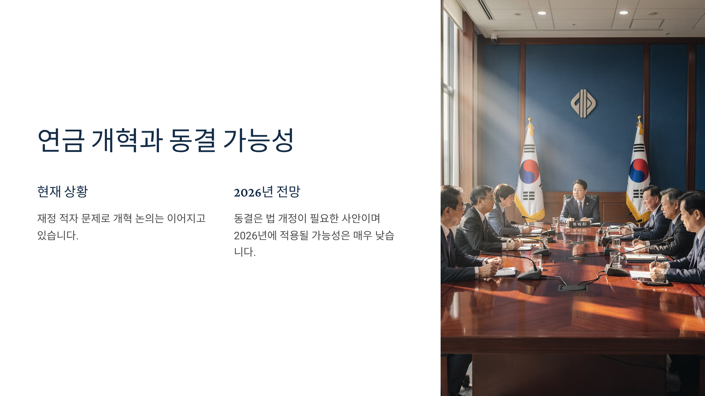 2. 연금 재정 적자 논란이 있지만 당장 2026년 동결 가능성은 낮습니다.