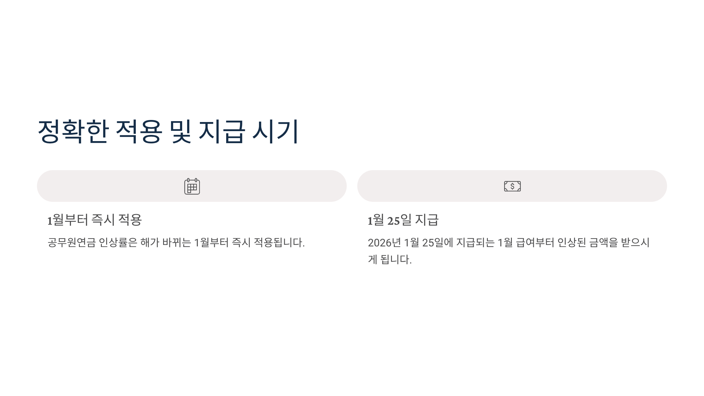 공무원연금 인상률은 해가 바뀌는 1월부터 즉시 적용됩니다. 따라서 2026년 1월 25일에 지급되는 1월 급여부터 인상된 금액을 받으시게 됩니다.