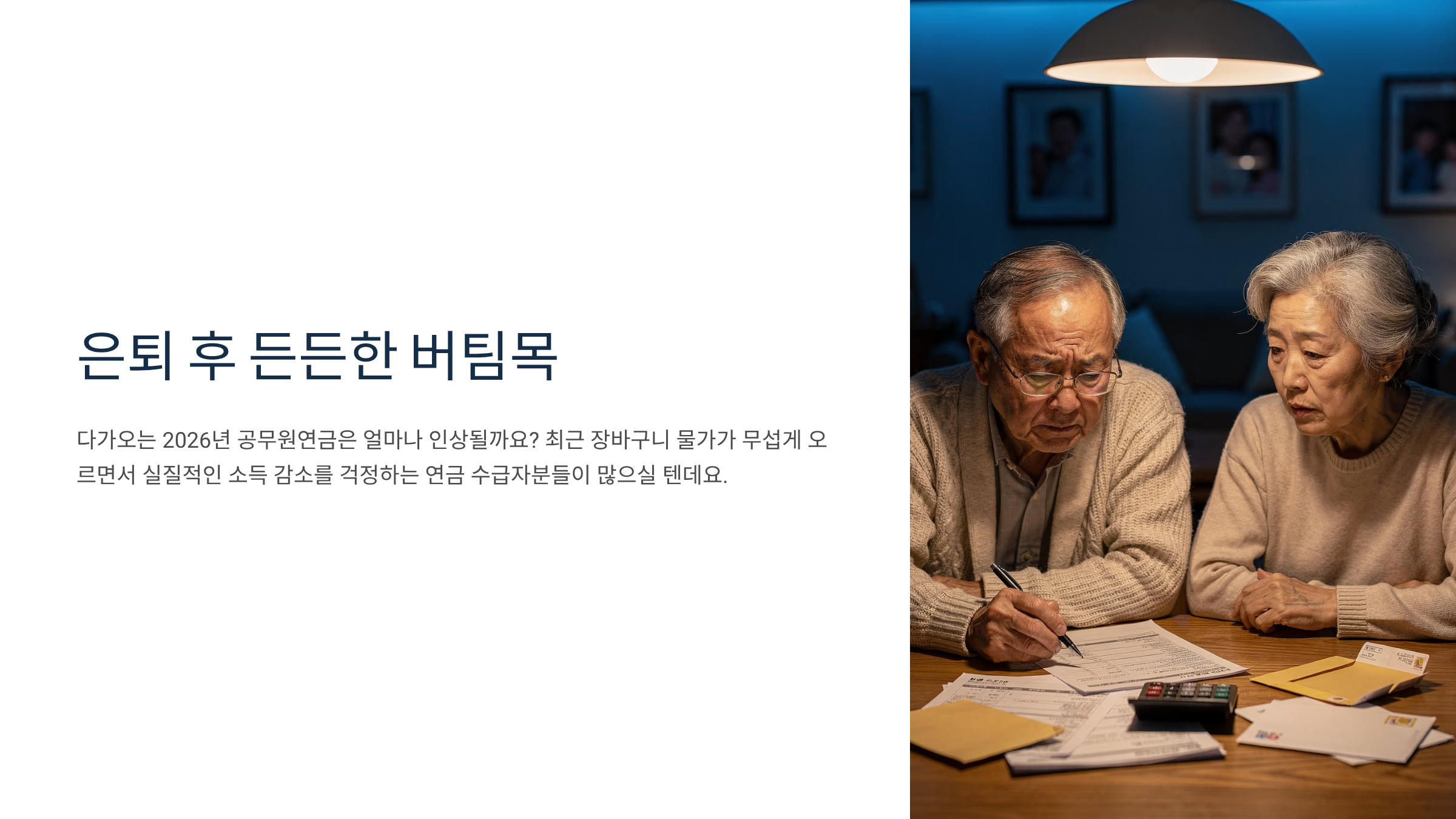 안녕하세요. 은퇴 후의 든든한 버팀목이 되어주는 공무원연금, 다가오는 2026년에는 과연 얼마나 인상될지 많은 분들이 궁금해하고 계십니다. 최근 장바구니 물가가 무섭게 오르면서 실질적인 소득 감소를 걱정하는 연금 수급자분들이 많으실 텐데요.