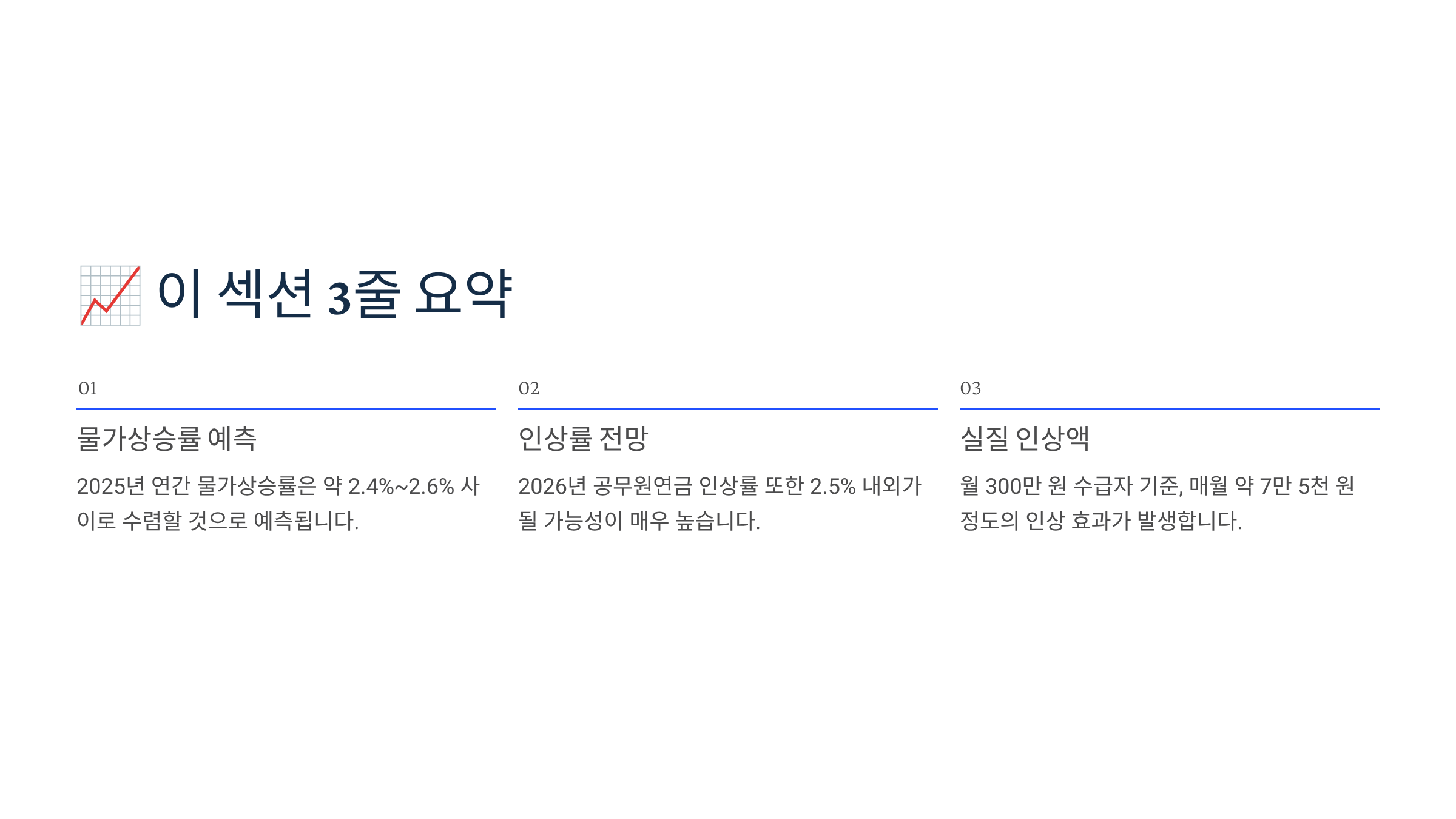 지금까지 2025년 경제 지표를 바탕으로 2026년 공무원연금 인상률을 전망해 보았습니다. 요약하자면, 내년도 인상률은 약 2.5% 수준이 될 것으로 보이며 이는 물가 상승분을 보전하여 연금의 실질 가치를 지키는 최소한의 안전장치가 될 것입니다.