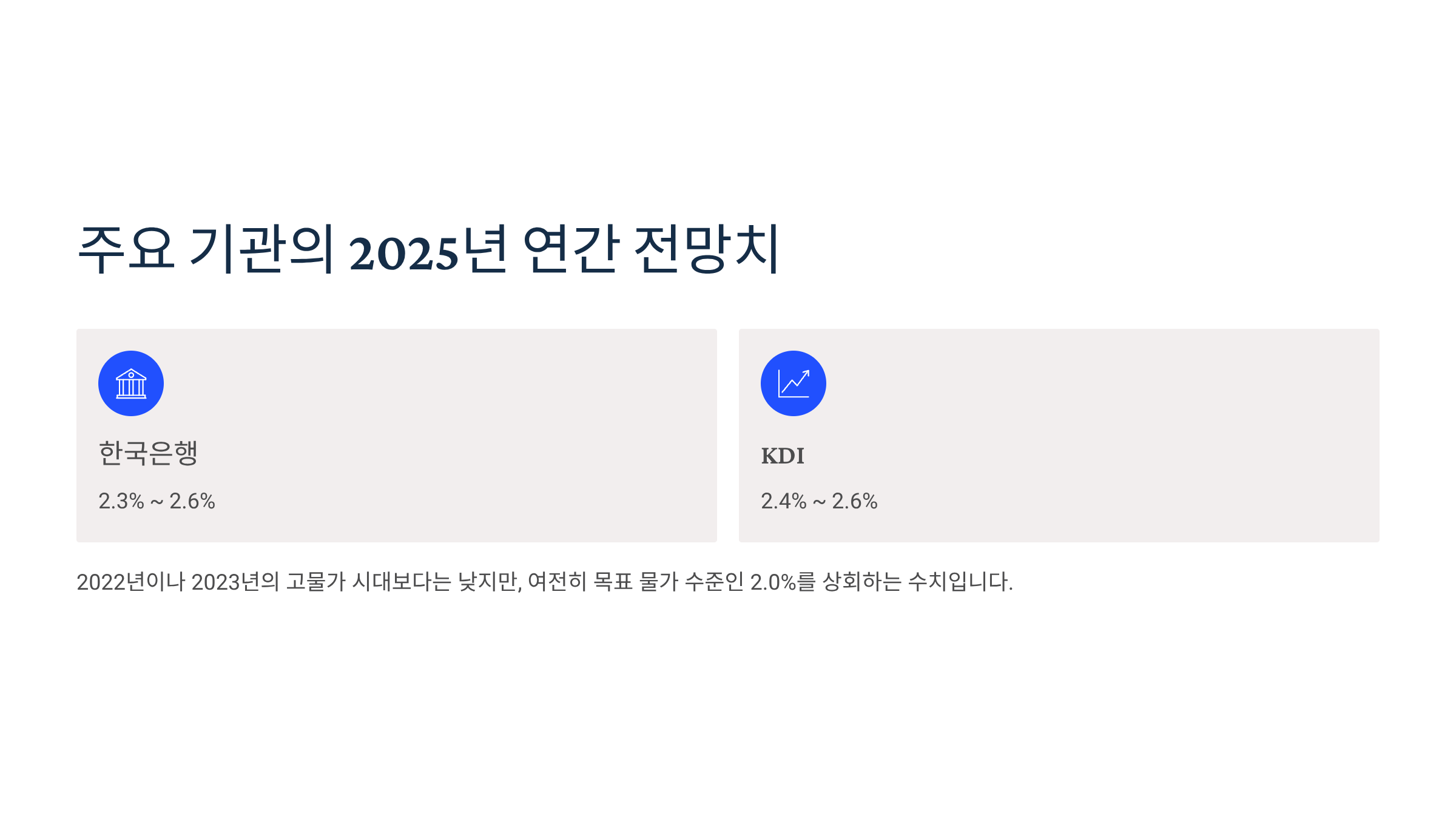 한국은행과 KDI 등 주요 경제 전문 기관들은 2025년 연간 소비자물가상승률을 2.3%에서 2.6% 사이로 전망하고 있습니다. 이는 2022년이나 2023년의 고물가 시대보다는 낮지만, 여전히 목표 물가 수준인 2.0%를 상회하는 수치입니다.