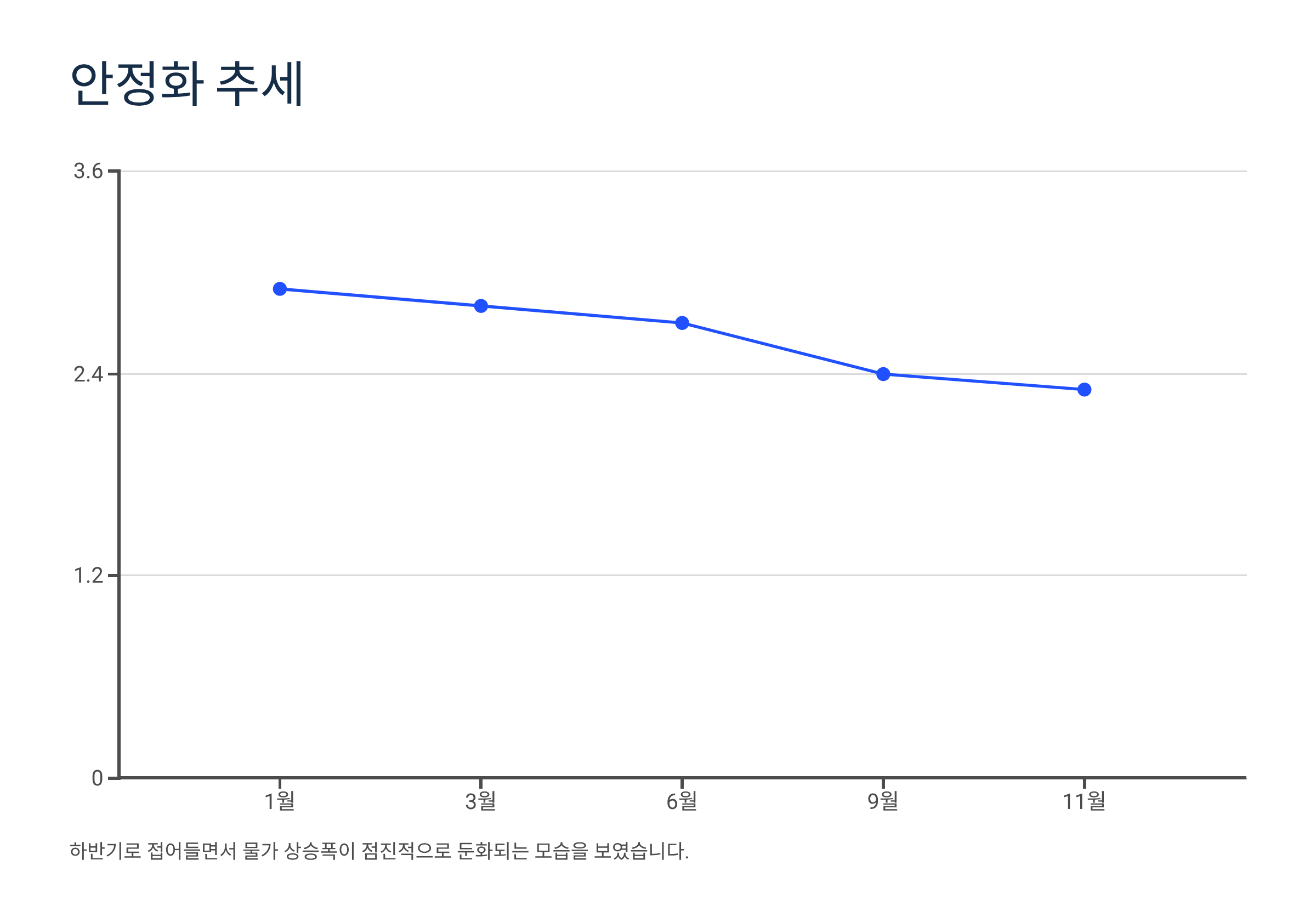 하반기로 접어들면서 고금리 기조의 영향으로 소비가 위축되고 국제 원자재 가격이 다소 안정화되면서 물가 상승폭이 둔화되었습니다. 정부의 물가 안정 정책 또한 일정 부분 효과를 거두며 월별 상승률이 2% 초중반대로 내려앉는 모습을 보였습니다.