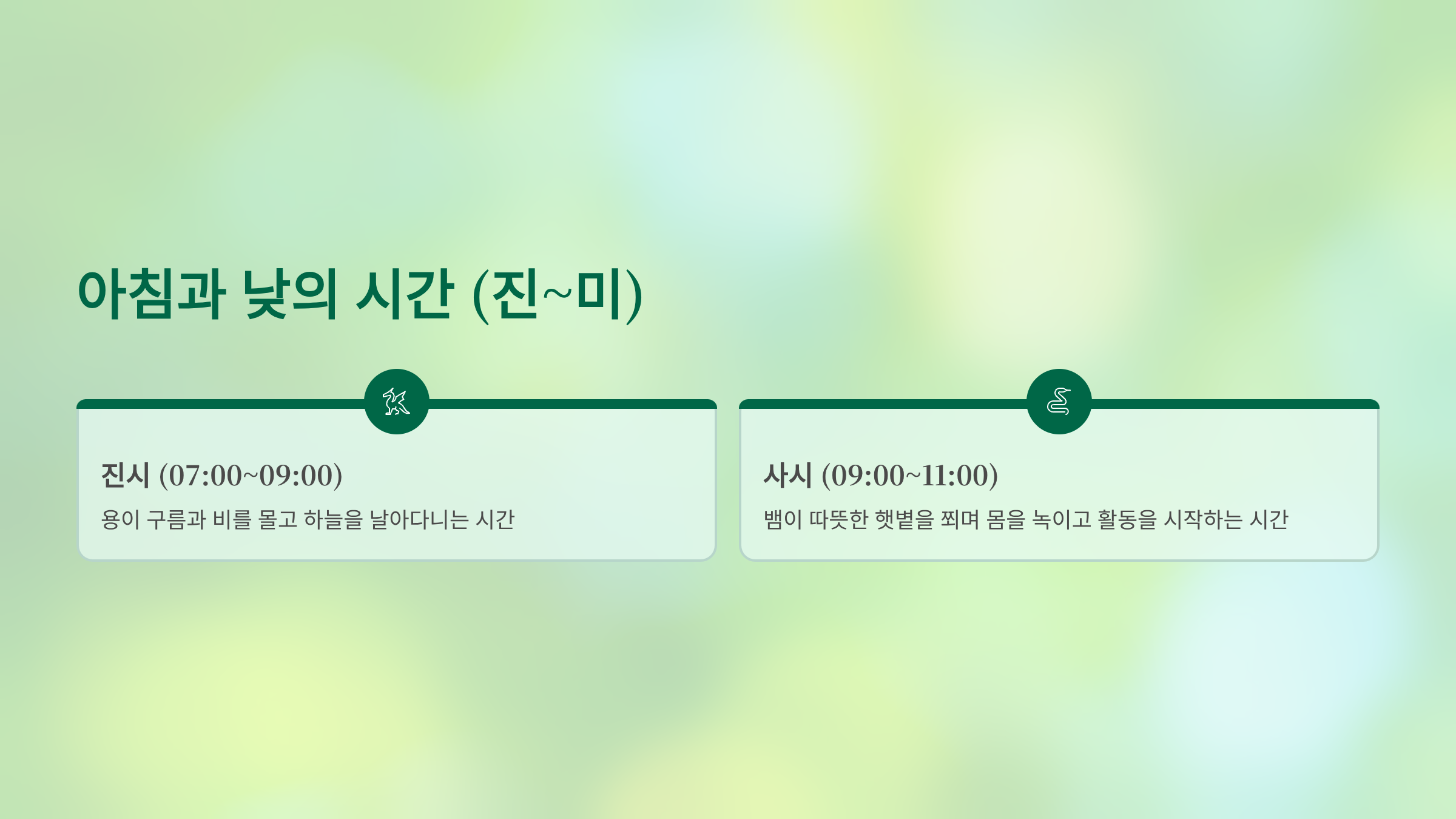 진시 (07:00 ~ 09:00): 용이 구름과 비를 몰고 하늘을 날아다니는 시간입니다.