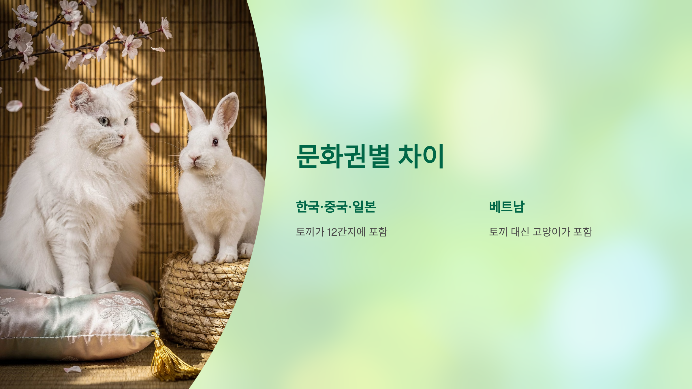 12간지에는 고양이와 코끼리, 사자 같은 동물이 없습니다. 이는 12간지가 만들어질 당시 고대 중국 등 동북아시아 지역에 해당 동물들이 서식하지 않았거나, 늦게 유입되었기 때문이라는 설이 유력합니다. 베트남 등 다른 문화권에서는 토끼 대신 고양이가 12간지에 포함되기도 합니다.
