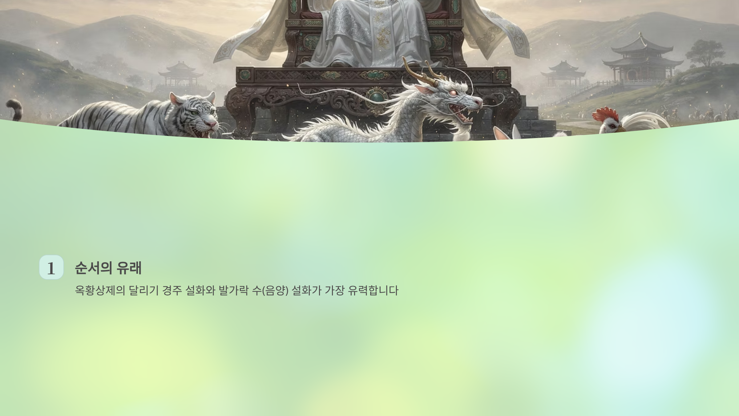 3. 순서의 유래는 옥황상제의 달리기 경주 설화와 발가락 수(음양) 설화가 가장 유력합니다.